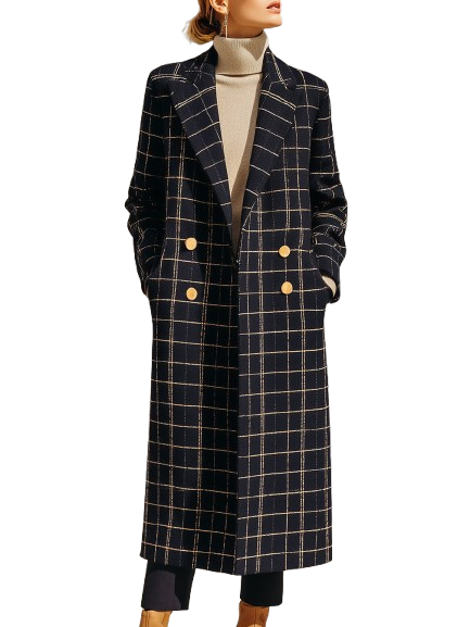 Brisa - Lange Zwarte Windowpane-jas met Gouden Knopen