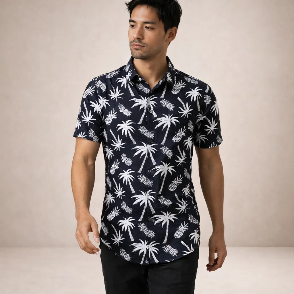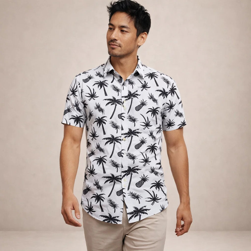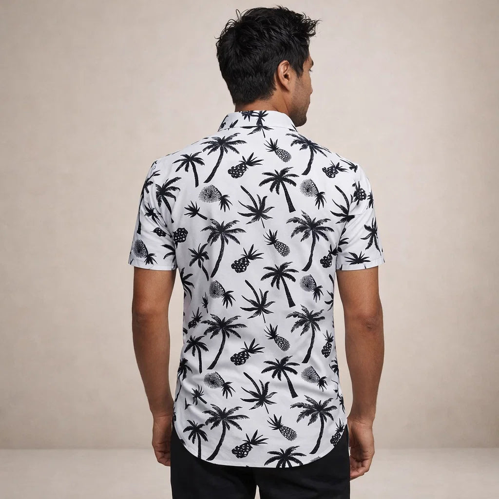 • Details: All-over Hawai print met palm- en ananasmotief, contrasterende knopen en een luchtige uitstraling voor zomers gebruik.