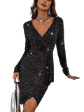 Anna - Zwarte Glitter Wrap Jurk met Lange Mouwen