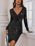 Anna – Zwarte Glitter Wrap Jurk met Lange Mouwen