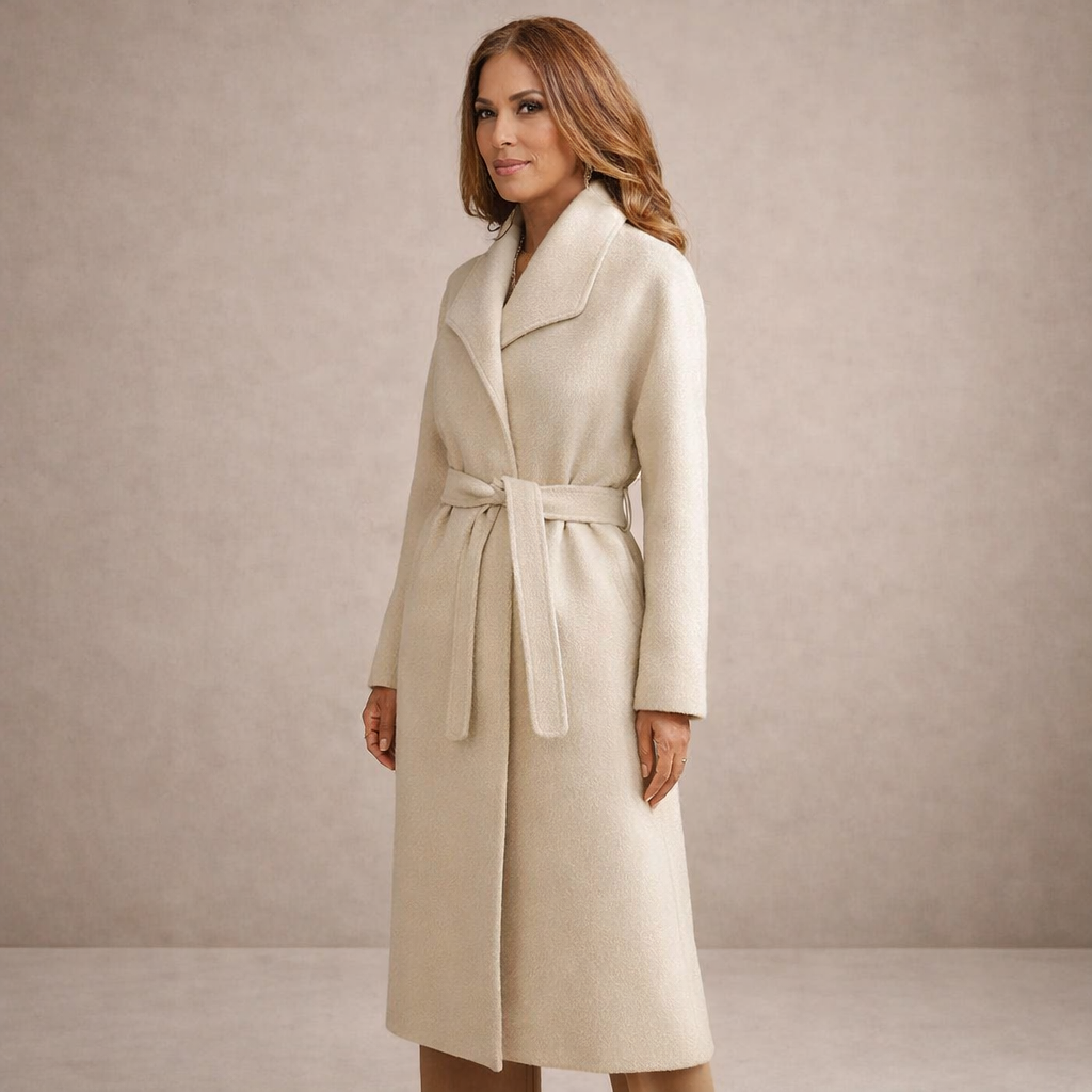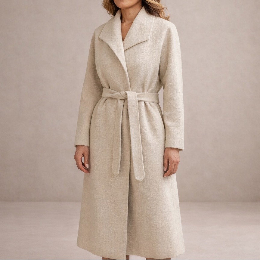 De Bavlina-mantel is gemaakt van zachte wolmix en heeft een sjaalkraag. De strikceintuur vormt de taille en de midi-lengte biedt goede dekking. Zakken aan de zijkant zorgen voor functionaliteit, ideaal voor werk, stadsuitjes of casual lagen.
