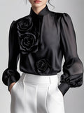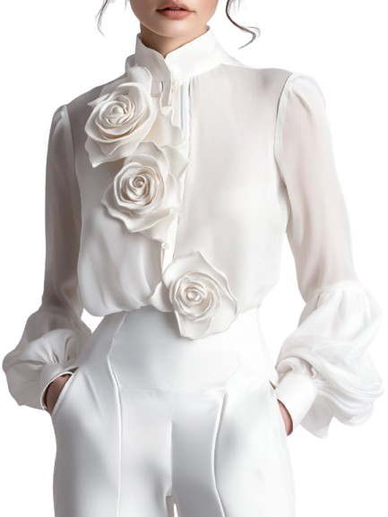 De Belarisse Blouse geeft een poëtische dimensie aan moderne elegantie. Fijne 3D rozenapplicaties lopen langs het voorpand en vormen een sculpturaal bloemmotief dat zowel artistiek als tijdloos aanvoelt. Met de hoge halslijn en transparante chiffonstof straalt deze blouse verfijning uit, terwijl de losse, sierlijke pasvorm comfort biedt voor elke gelegenheid. Perfect te combineren met een elegante rok of een strakke pantalon, ideaal voor zowel overdag als ’s avonds.