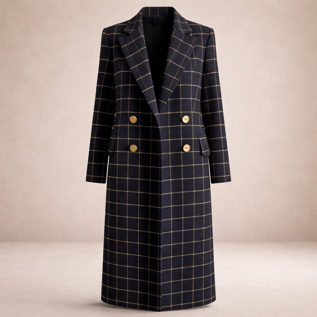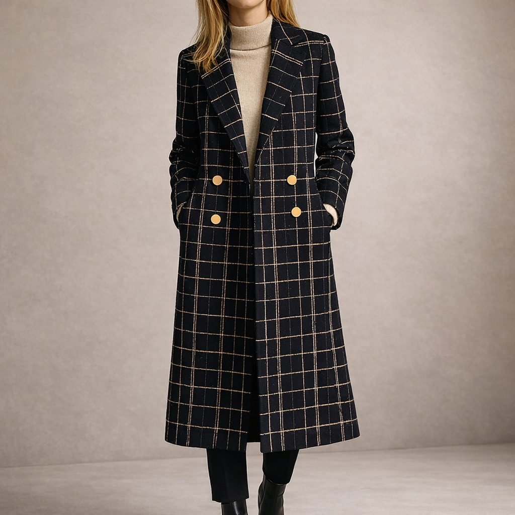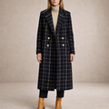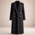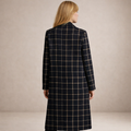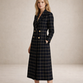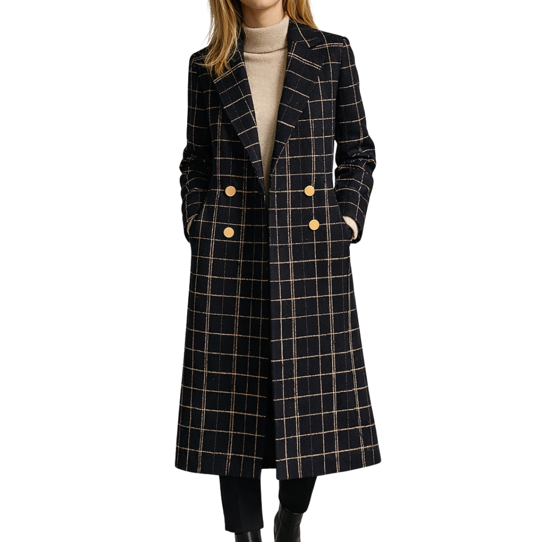 Deze lange zwarte jas is uitgevoerd met een klassiek windowpane-ruitpatroon en een gestructureerde pasvorm. Het model heeft een dubbelgeknoopte sluiting met goudkleurige knopen, een reverskraag en lange mouwen met een nette afwerking. De jas valt recht langs het lichaam en is afgewerkt met een lange zoom en subtiele visuele details, geschikt voor een verzorgd en representatief uiterlijk binnen een webshopassortiment.