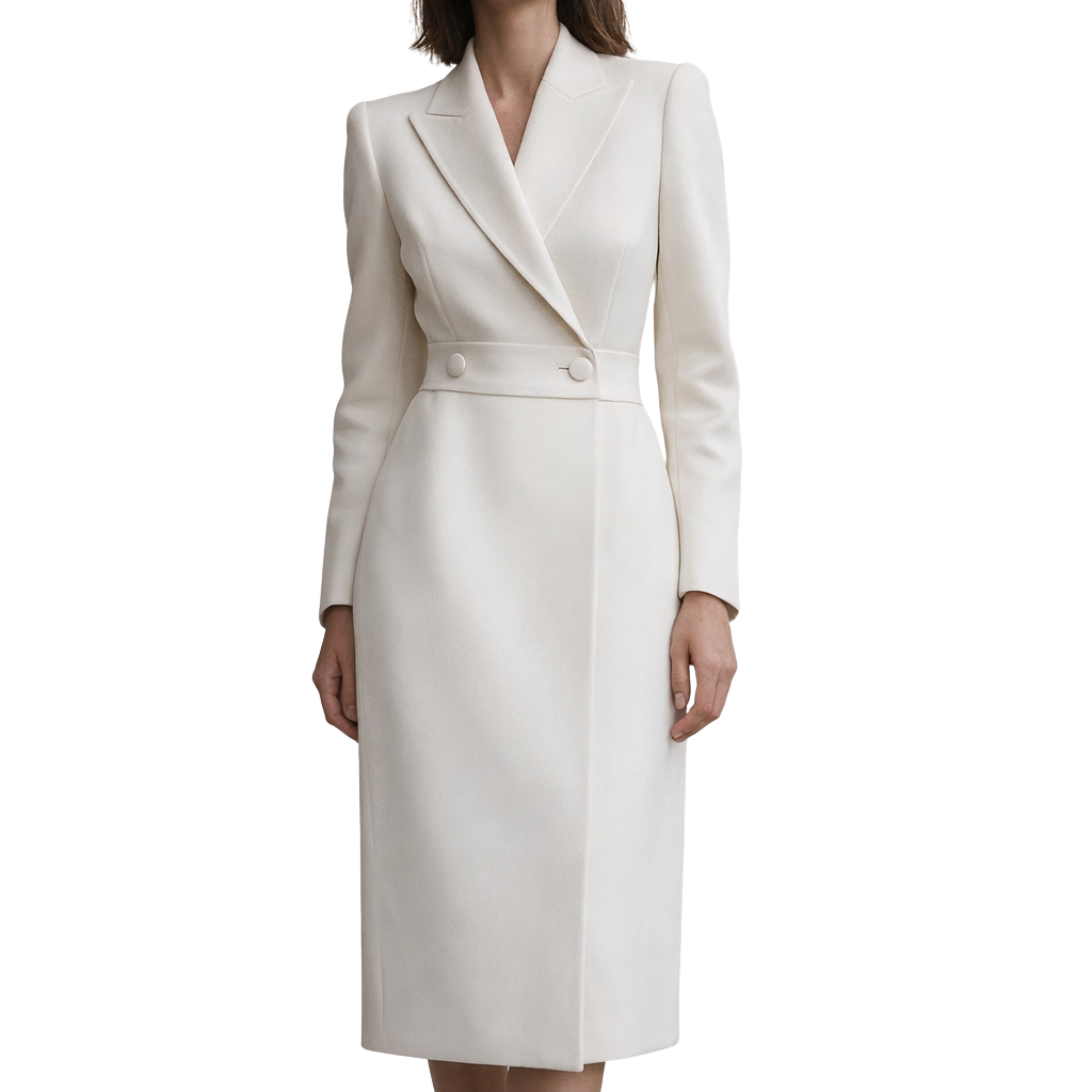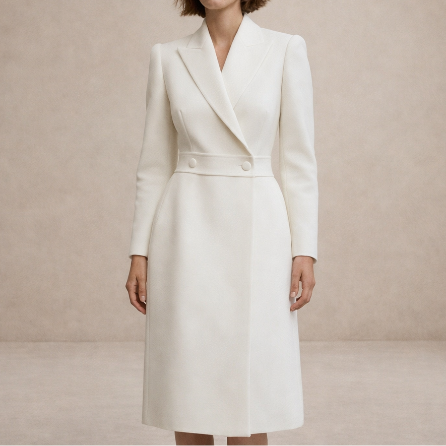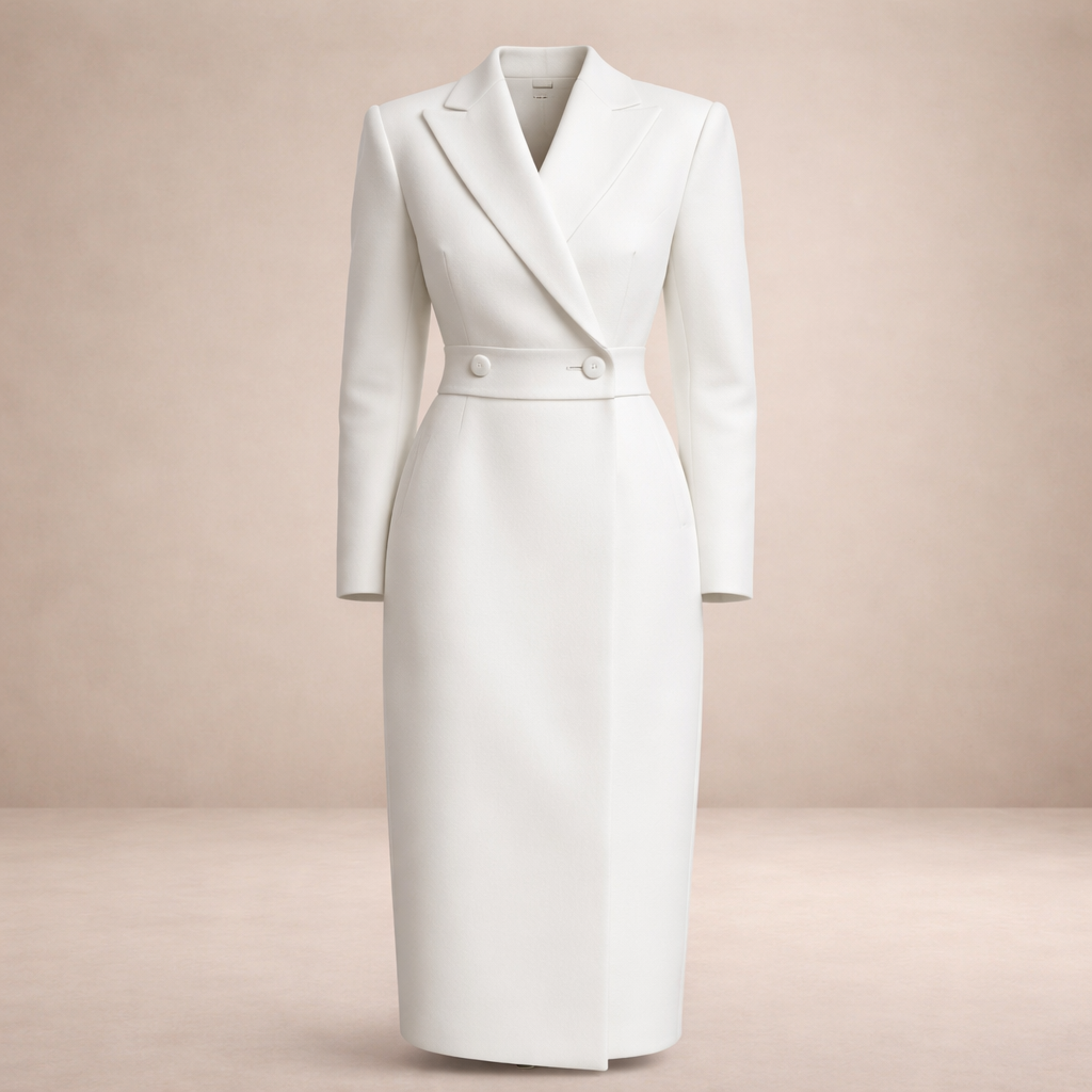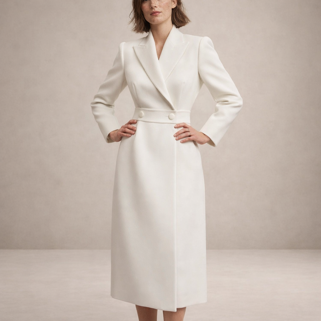De Celina-manteljurk combineert gestructureerde tailoring met een flatterende A-lijn. Gemaakt van hoogwaardige wolmix, met een double-breasted sluiting, ceintuur in de taille en scherpe schouders voor een verzorgde uitstraling.