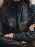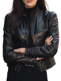 Het Claret-jack belichaamt tijdloze stijl met zijn strakke zwarte leren afwerking en verfijnde snit. Met een hoge kraag, ritssluiting en subtiele stikselaccenten combineert het structuur met moeiteloze elegantie. Het kortere model benadrukt het figuur en laat zich zowel met denim als over een jurk perfect stylen. Een veelzijdig kledingstuk dat moeiteloos de brug slaat tussen casual chic en avondlijke allure.