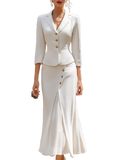 De Elvessia Set is een verfijnd tweedelig ensemble dat tijdloze snit combineert met moderne vrouwelijkheid. De getextureerde blazer met gouden knopen en een peplum taille vormt een stijlvolle combinatie met de A-lijn midi-rok, afgewerkt met vloeiende chiffon accenten. Perfect voor vergaderingen, bruiloften of elegante lunches, dit set straalt moeiteloze elegantie uit van dag tot avond.