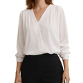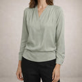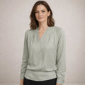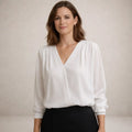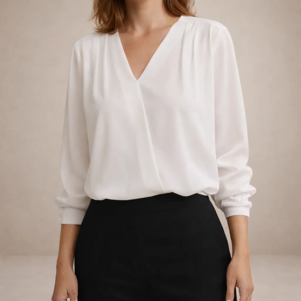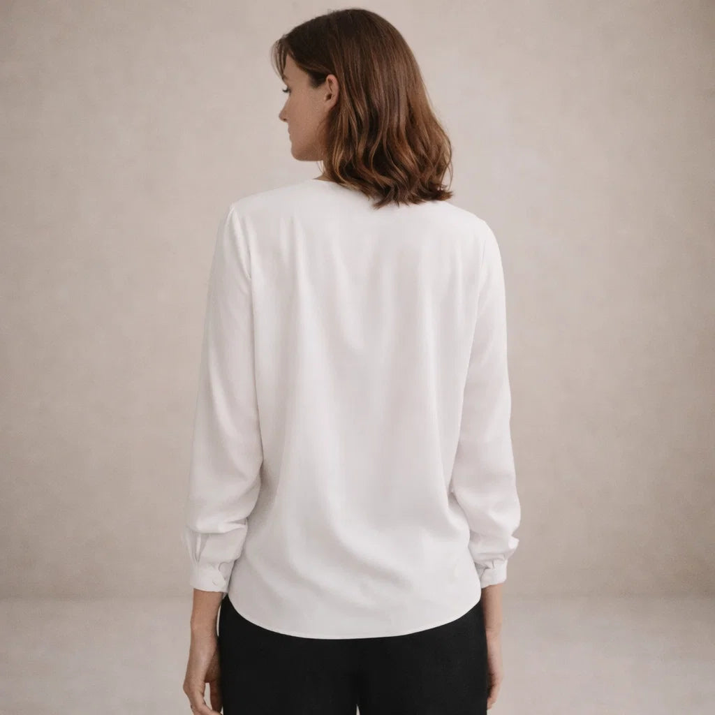 Deze damesblouse heeft een elegante en tijdloze uitstraling en is ontworpen voor veelzijdig dagelijks gebruik. Het model is uitgevoerd met een V-hals zonder sluiting, wat zorgt voor een open en verfijnde halslijn. De lange mouwen vallen soepel langs de armen en zijn afgewerkt met een nette manchet voor een verzorgde look. De rechte zoom maakt de blouse geschikt om zowel los te dragen als gecombineerd met een broek of rok. Het ontwerp is bewust algemeen gehouden en geschikt voor meerdere varianten.