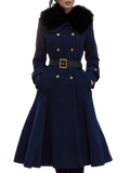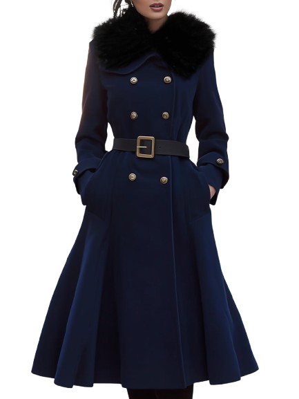 De Féline-mantel is ontworpen voor een luxe uitstraling met een verfijnd silhouet. Deze jas is gemaakt van een hoogwaardige wolmix in diep marineblauw en afgewerkt met een zachte faux-fur kraag. De double-breasted sluiting met gouden knopen en de afneembare strikceintuur benadrukken de taille en zorgen voor een elegante pasvorm. De vloeiende midi-zoom geeft de jas een stijlvolle beweging, ideaal voor zowel formele gelegenheden als dagelijkse winterlooks.