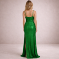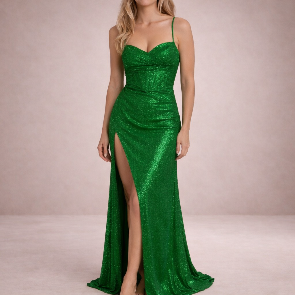- Details: Smaragdgroene glitterstof, aansluitende taille en een hoge split zorgen voor een verfijnde en opvallende afwerking.