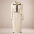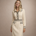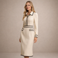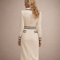 Deze midi-jurk is uitgevoerd met een gladde, licht gestructureerde stof en een slank, vrouwelijk silhouet. Het model heeft een doorlopende knoopsluiting aan de voorzijde, een klassieke kraag met V-opening en lange mouwen met nette manchetten. De jurk is afgewerkt met contrasterende biezen langs de kraag, taille, zakken en zoom, wat zorgt voor een duidelijk omlijnd en verzorgd ontwerp dat geschikt is voor een representatieve webshoppresentatie.