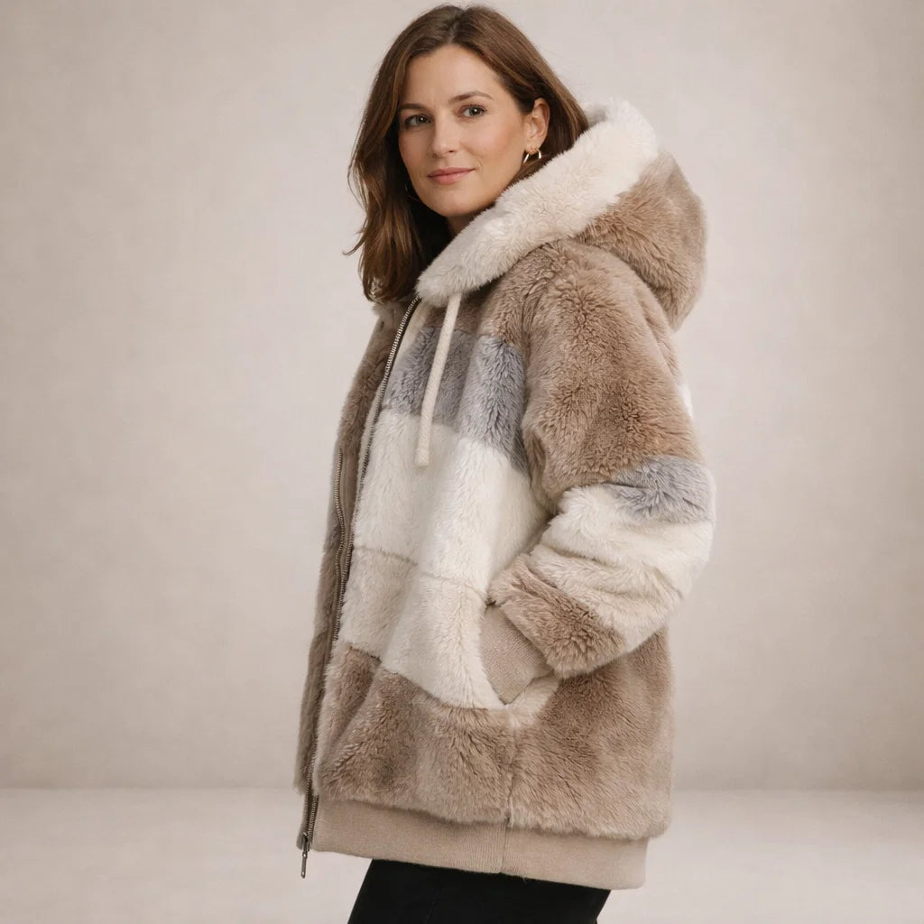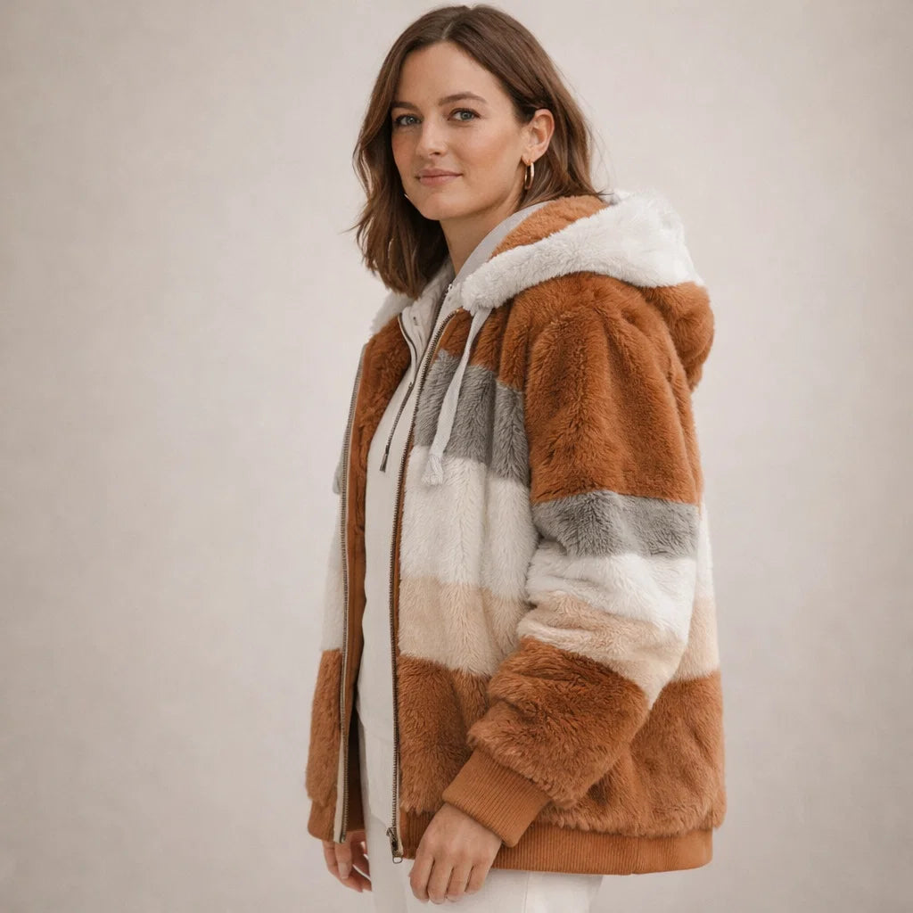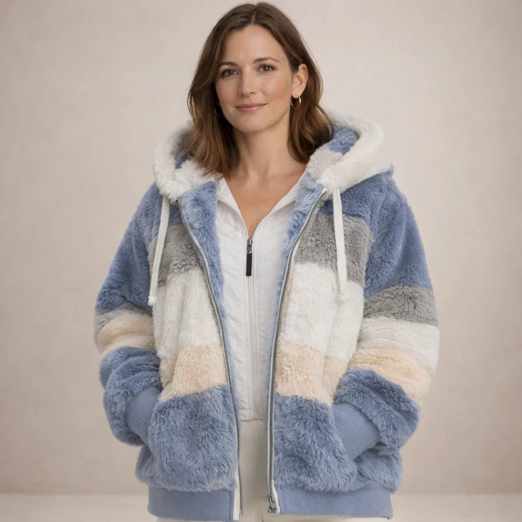 Freya – Oversized Teddy Jas met Capuchon in Kleurblokken