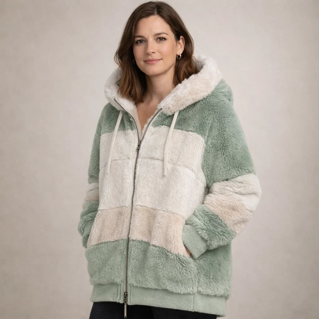 Freya – Oversized Teddy Jas met Capuchon en Kleurblokken