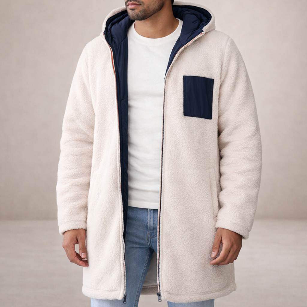 Gino – Omkeerbare Lange Teddy Coat voor Heren (Beige/Blauw)