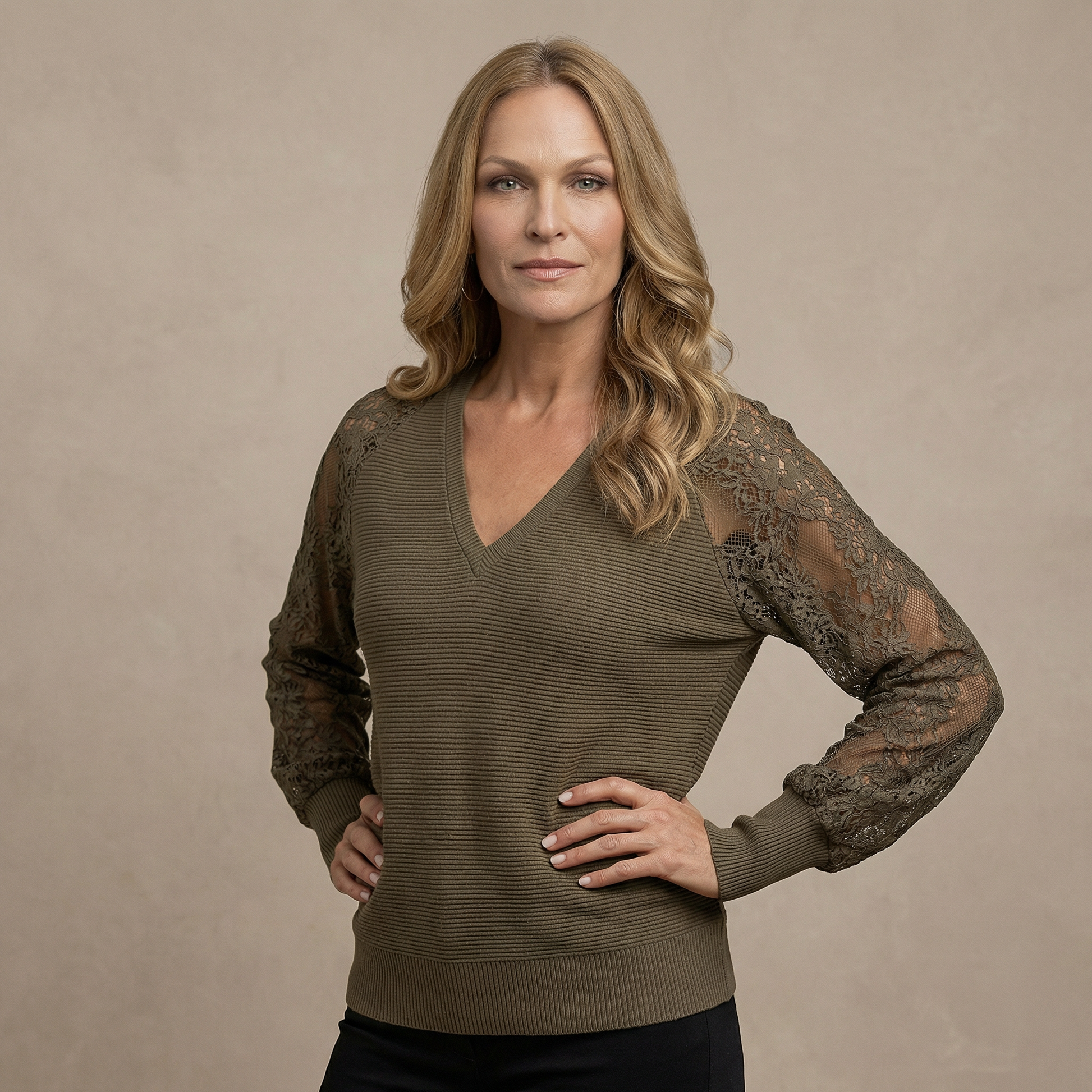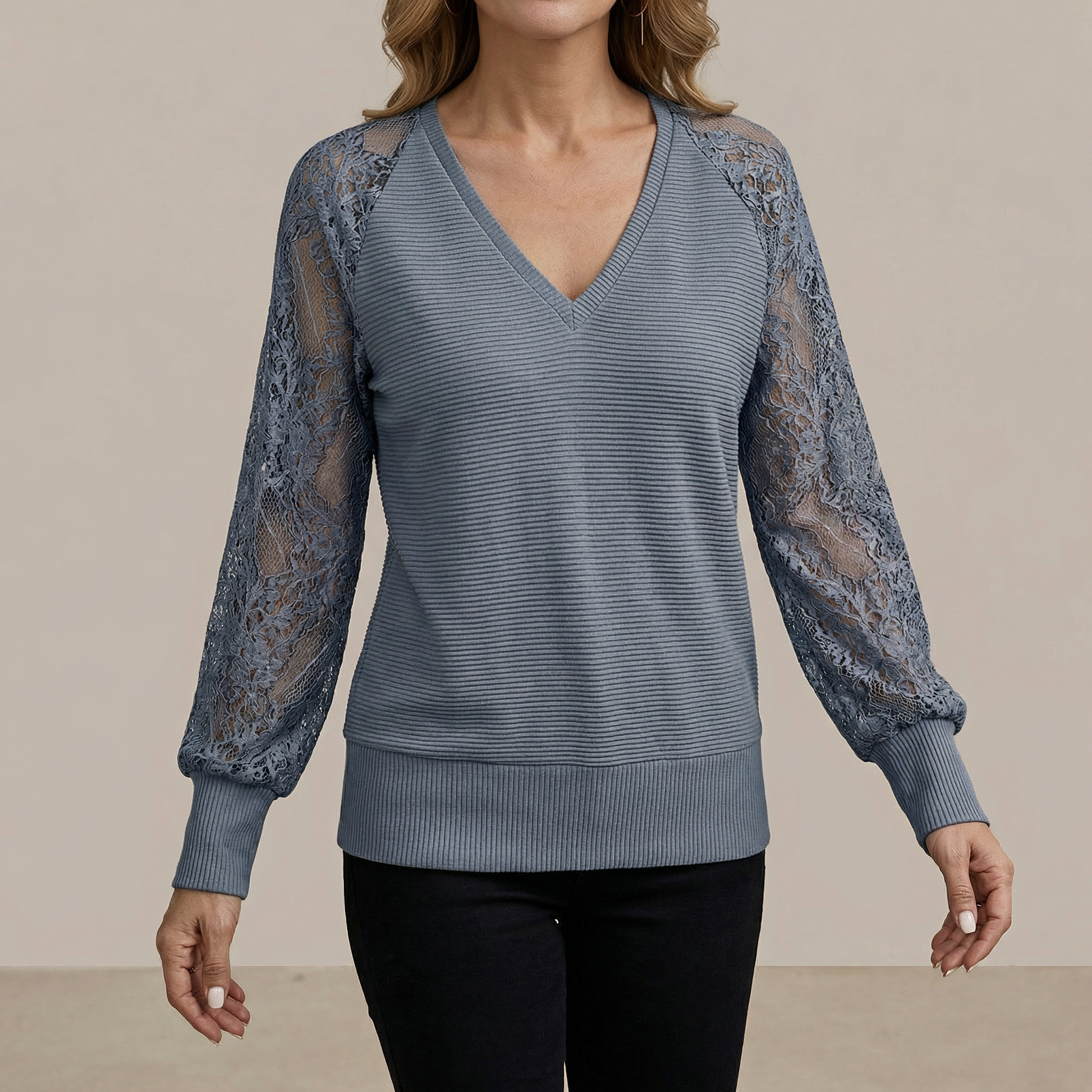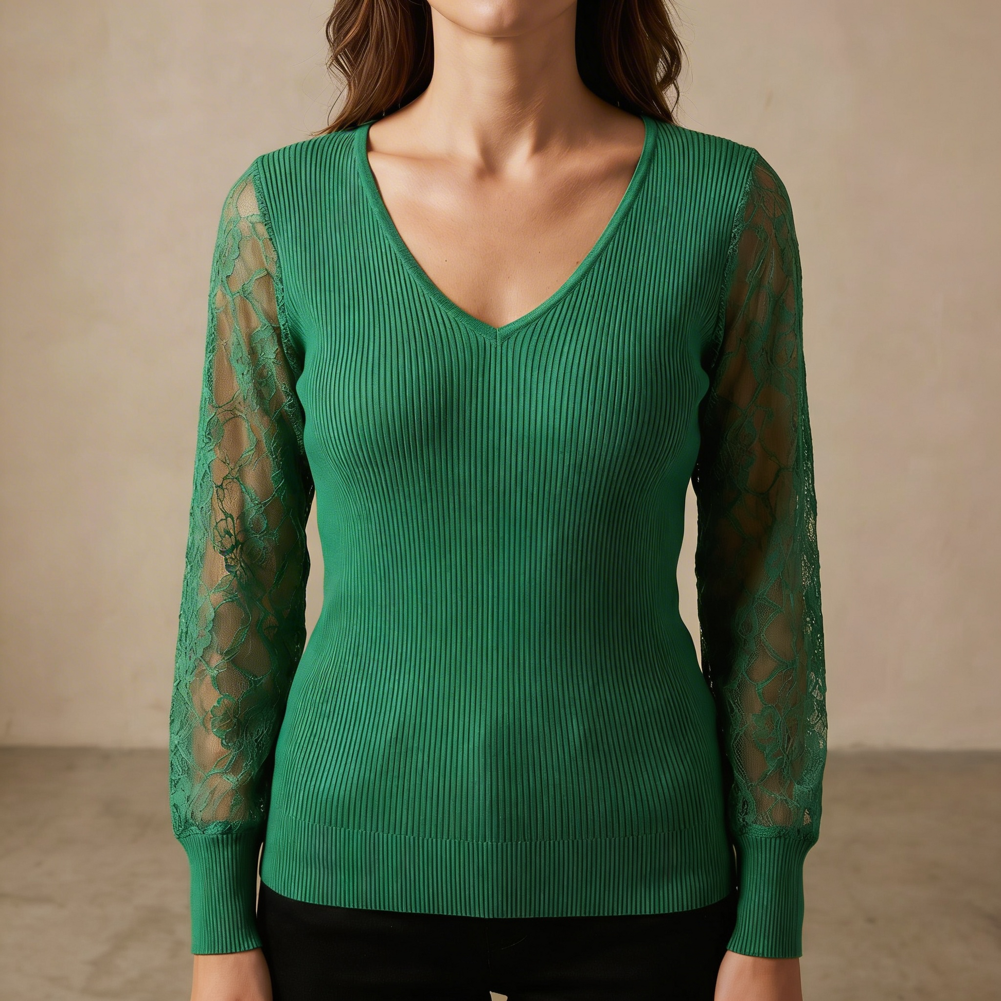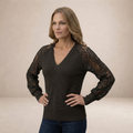 - Details: Diepe V-hals, verfijnde kantdetails op de mouwen, zachte en comfortabele stof en een veelzijdig design dat moeiteloos combineert met jeans, rokken of nette broeken.