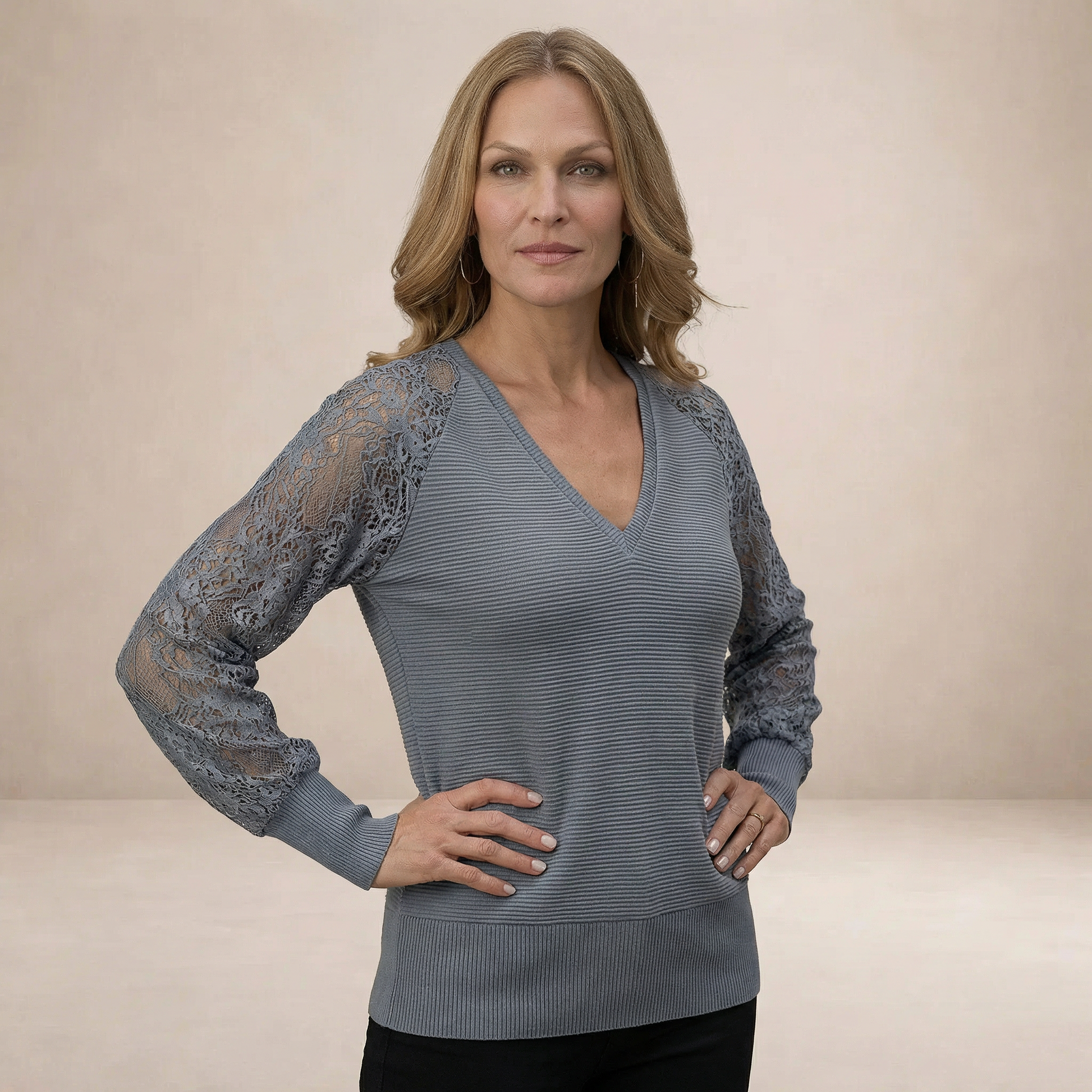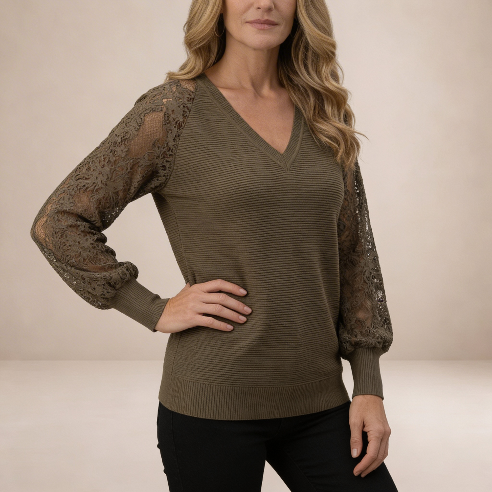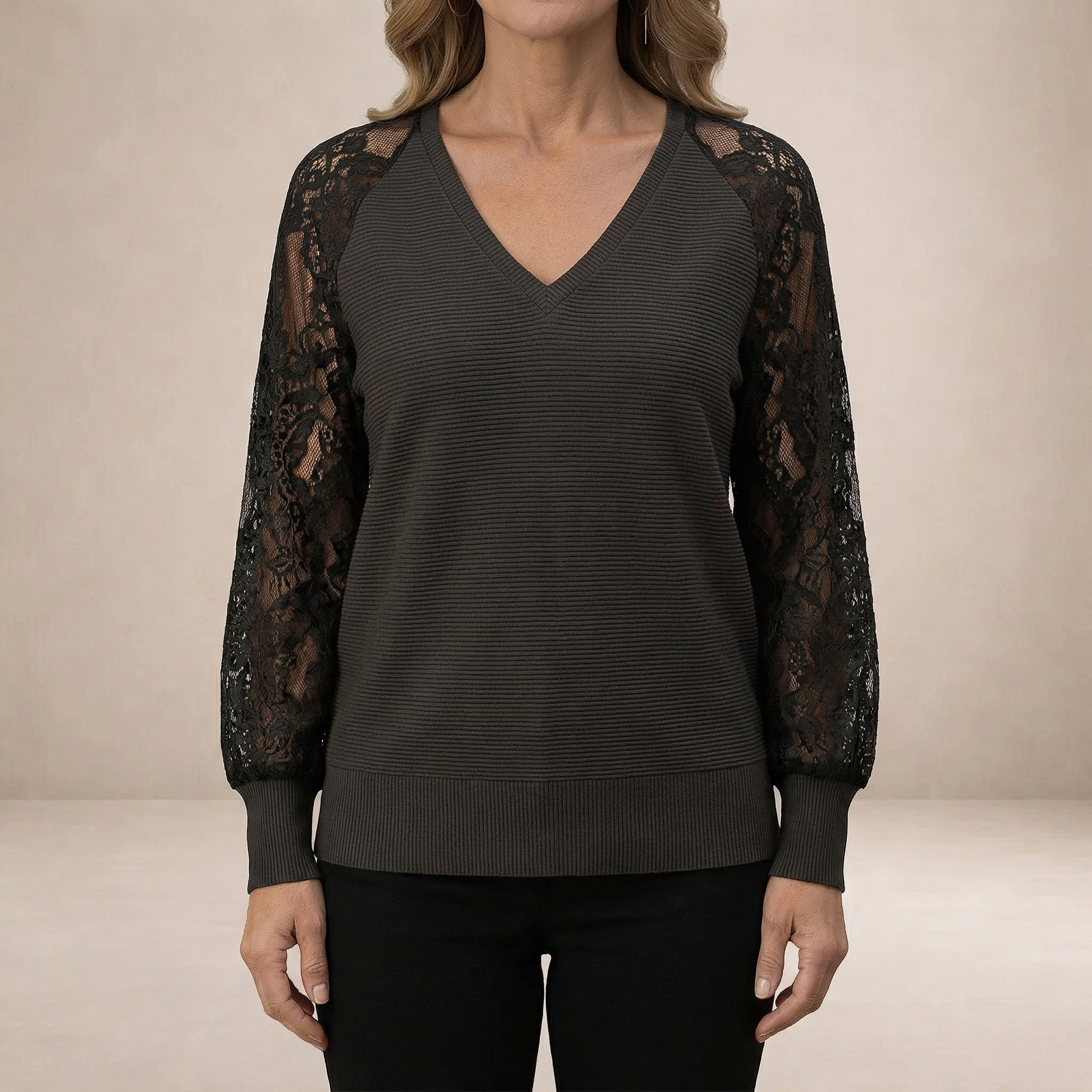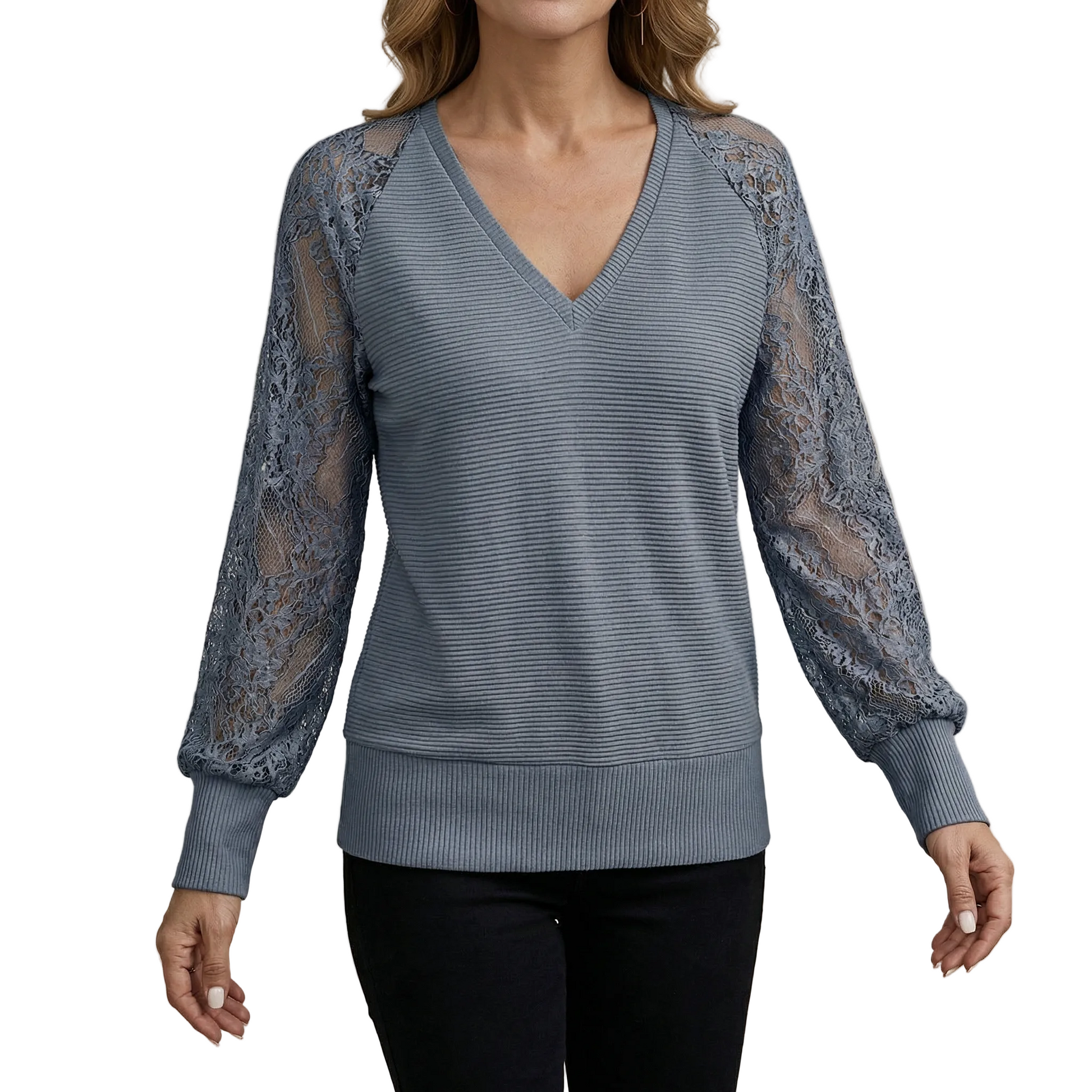 - Details: Diepe V-hals, verfijnde kantdetails op de mouwen, zachte en comfortabele stof en een veelzijdig design dat moeiteloos combineert met jeans, rokken of nette broeken.