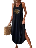 De Kaia maxi jurk is jouw ultieme zomerstuk. Met speelse geometrische patronen, een ronde zoom en fijne spaghettibandjes combineert ze comfort met stijl. De losse pasvorm beweegt prachtig mee en laat je huid ademen op warme dagen.