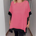 Breng een vleugje flair en rust in je garderobe met dit unieke topje. Het combineert een trendy en comfortabel ontwerp met vleermuismouwen en een kleurblokpatroon, wat zorgt voor een moderne, eigentijdse look. Het zachte materiaal voelt heerlijk aan op de huid en straalt elegantie uit, ongeacht je lichaamsvorm of maat.