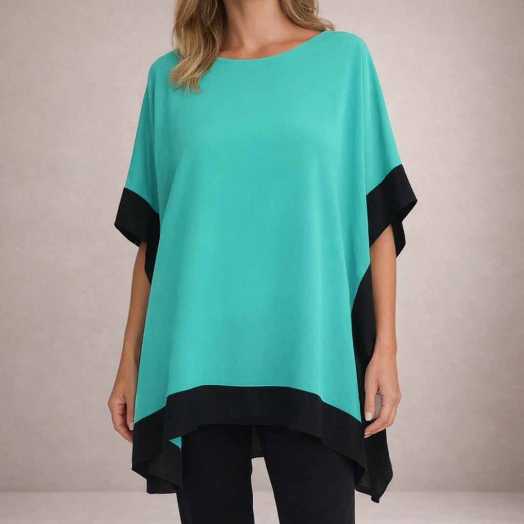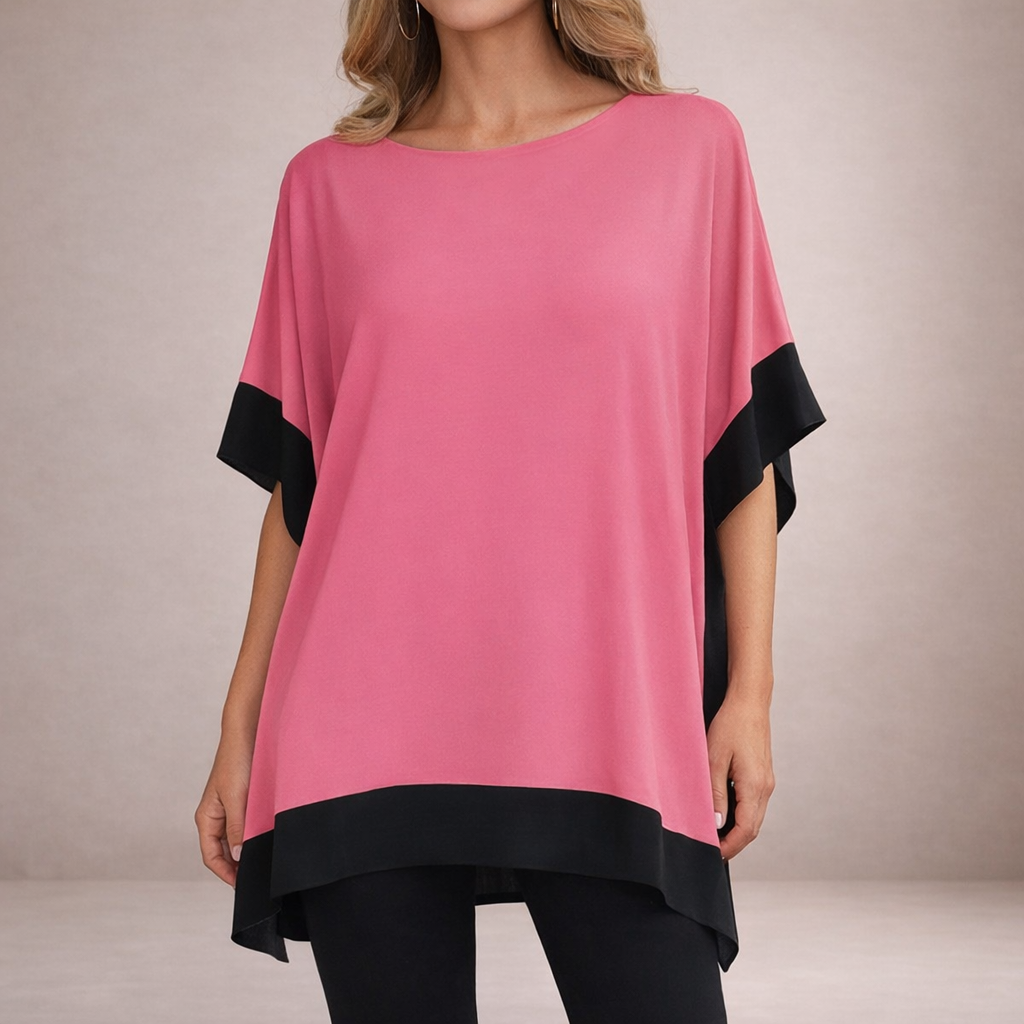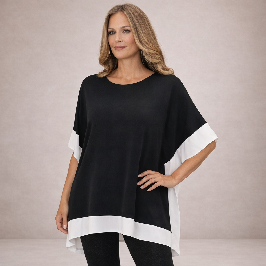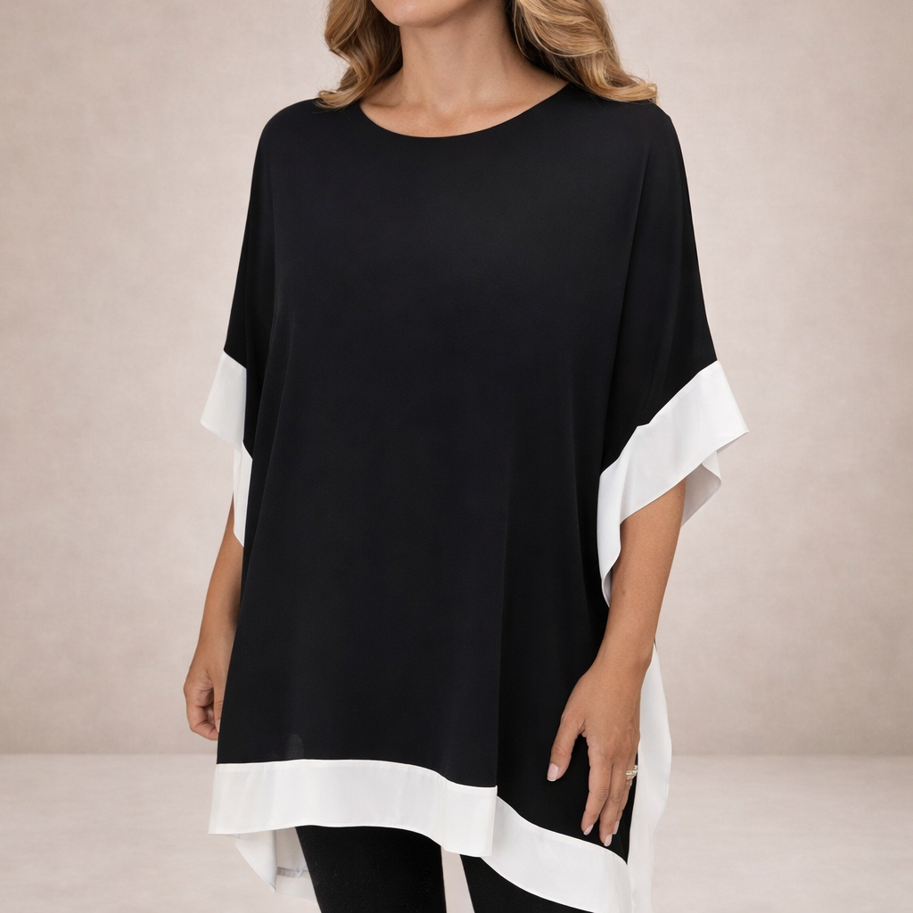 De Kaye top brengt moeiteloze flair en comfort samen in één veelzijdig ontwerp. De losse pasvorm en speelse vleermuismouwen creëren een moderne, ontspannen uitstraling, terwijl het subtiele kleurblokdetail zorgt voor een stijlvolle twist. Perfect voor vrouwen die houden van comfortabele mode met een eigentijdse uitstraling.