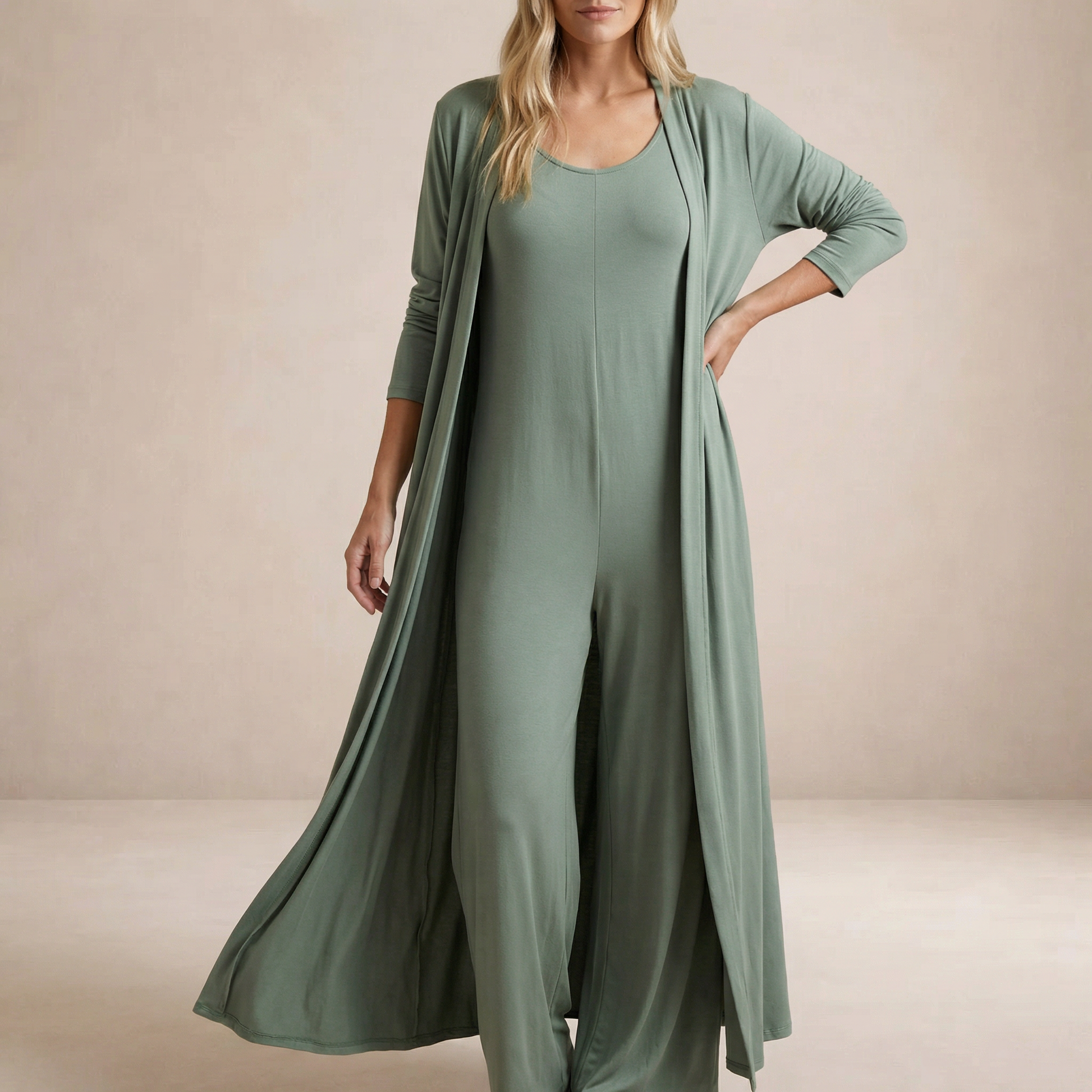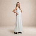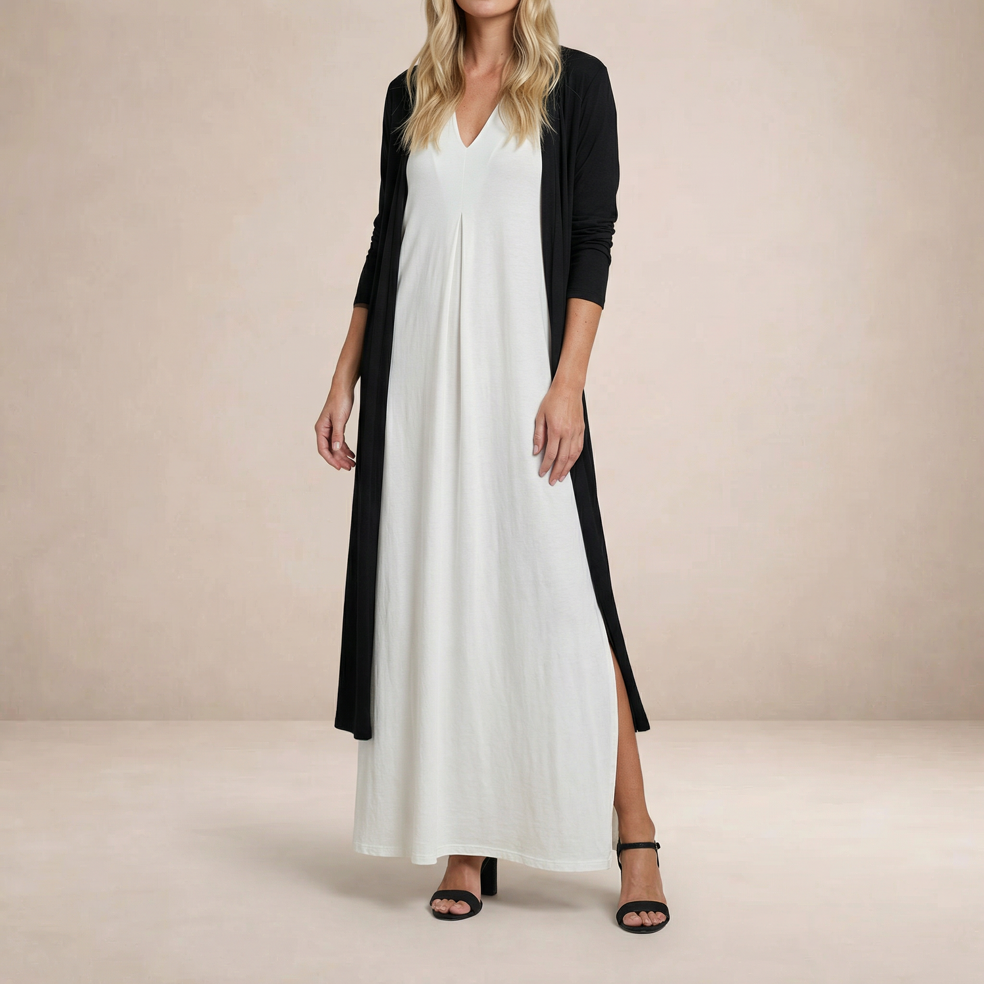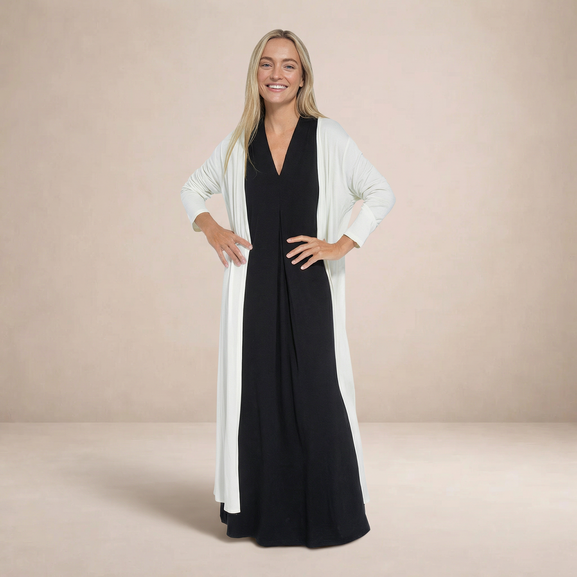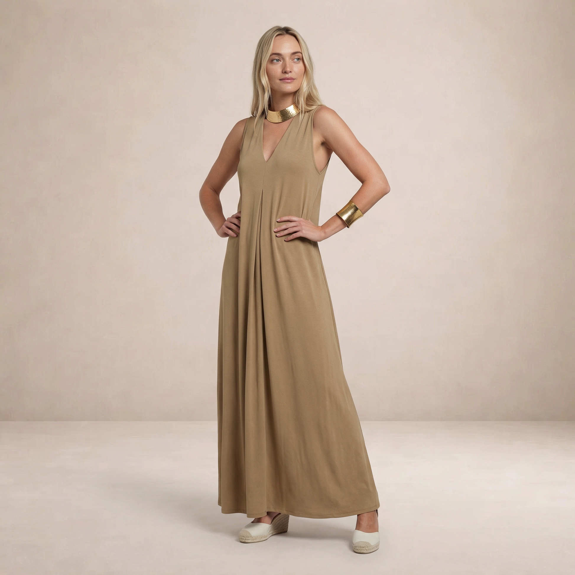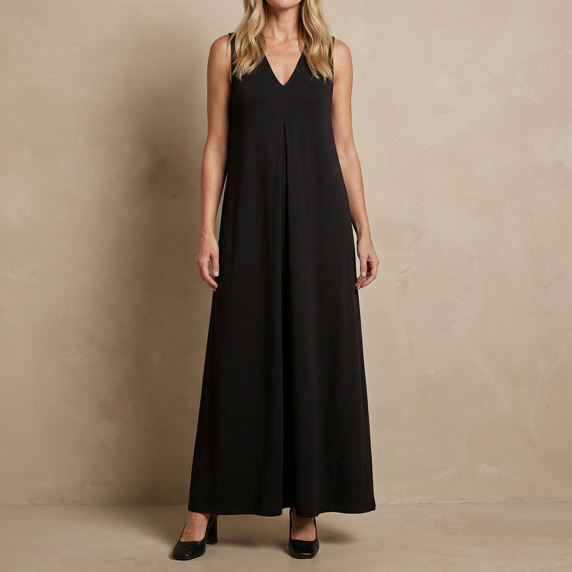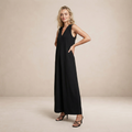 Laat je betoveren door de tijdloze elegantie van de Kendra jurk. Deze vloeiende maxi jurk valt prachtig langs het lichaam en creëert een vrouwelijk, flatterend silhouet. Perfect voor zowel een zomerse dag als een stijlvolle avond, biedt Kendra moeiteloze klasse en ultiem draagcomfort in één ontwerp.
