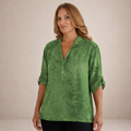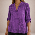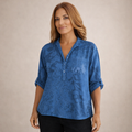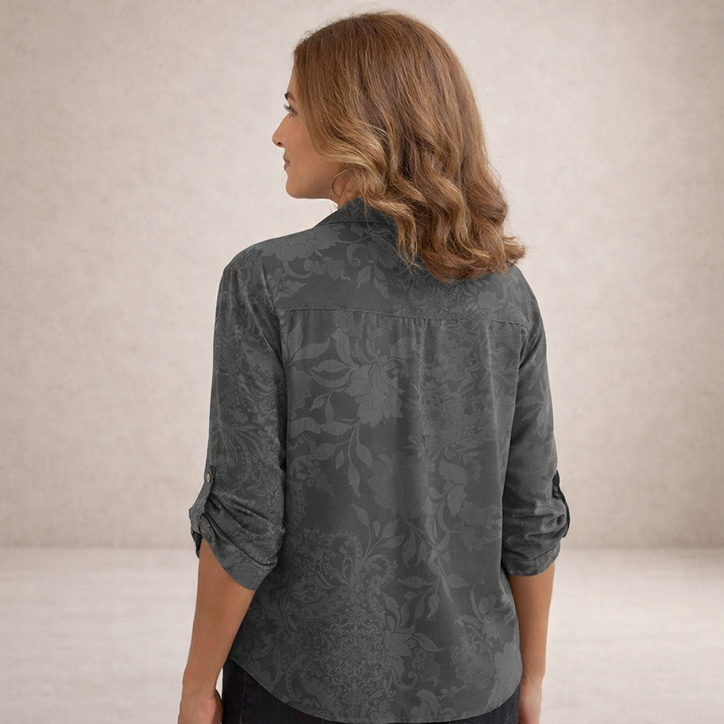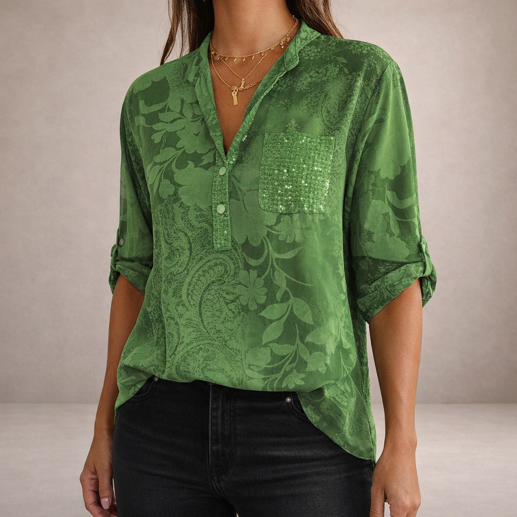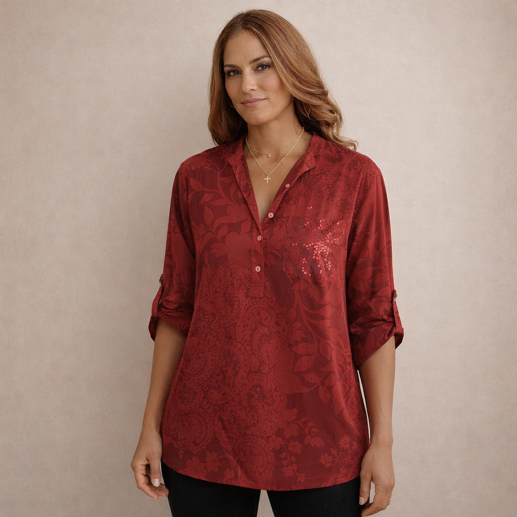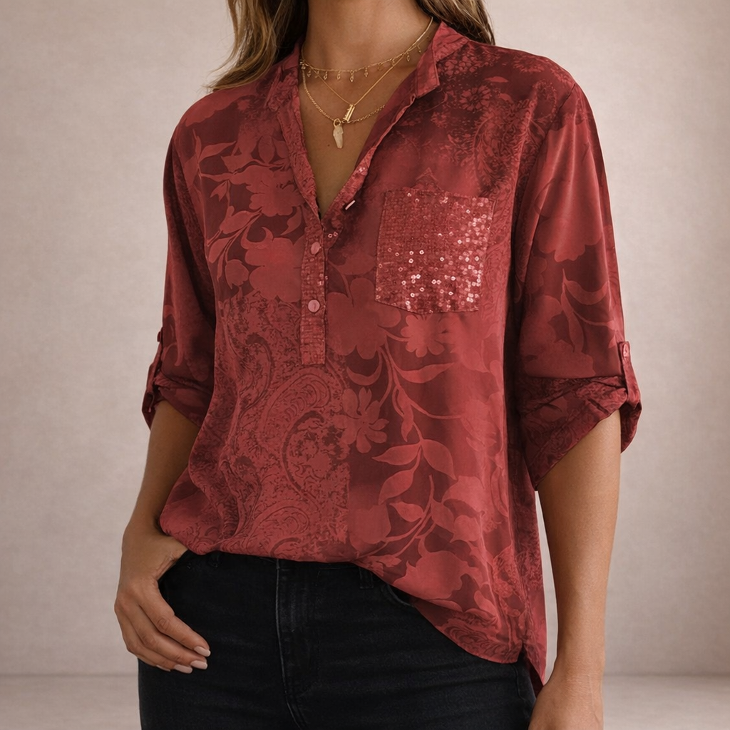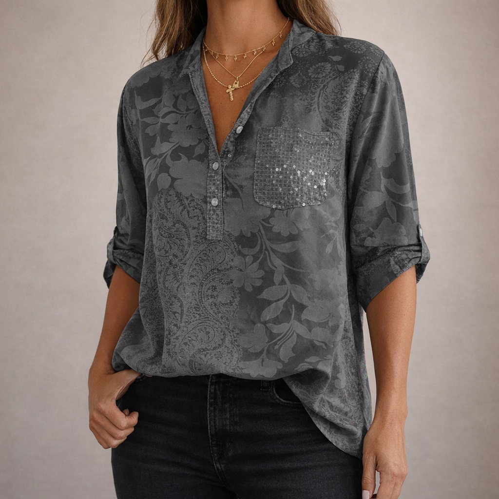 - Details: Reverskraag, subtiele all-over print, pailletten borstzakje als opvallend accent, licht en ademend materiaal, elegant en eenvoudig te combineren met jeans of een nette broek.
