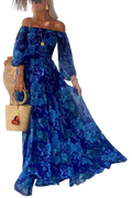 Kiki - Dames Off-Shoulder Maxi Jurk met Blauwe Bloemenprint