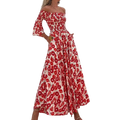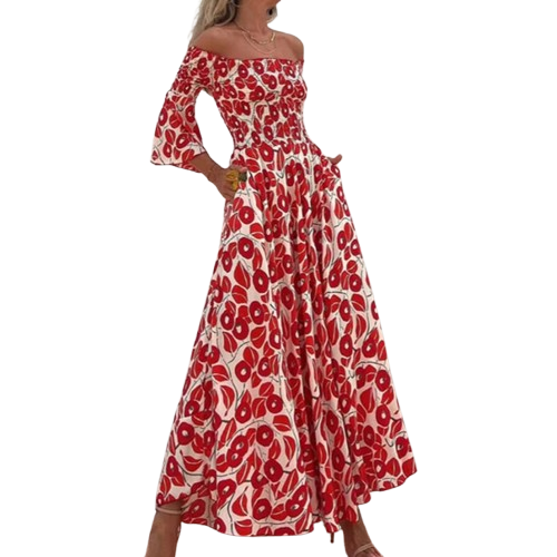 Met haar off-shoulder ontwerp, elastische taille en vloeiend lange rok biedt deze jurk een flatterende pasvorm én luchtig draagcomfort. De opvallende rood-witte bloemenprint zorgt voor een frisse, vrouwelijke look – perfect voor zonnige dagen, vakanties of een zomerse brunch.