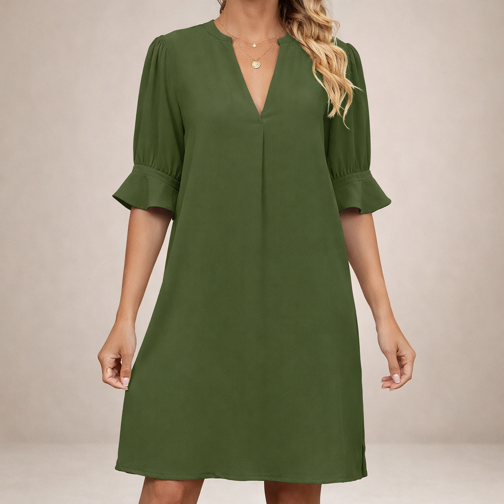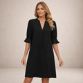 - Mouwen: Halflange mouwen met subtiele ruches voor een speelse touch.