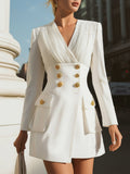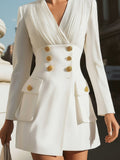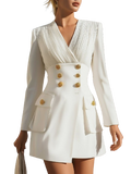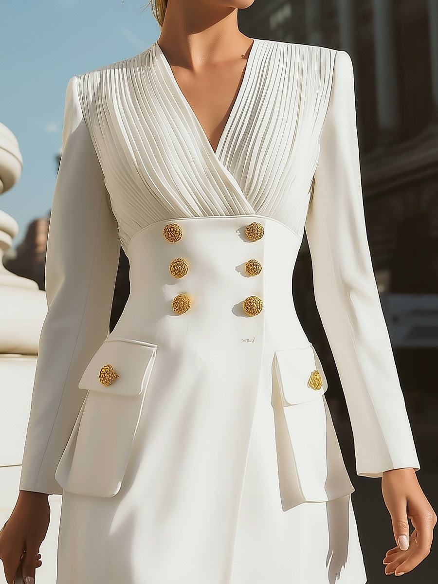De Liora Jurk combineert strakke tailoring met subtiele elegantie. Het geplisseerde crossover-lijfje voegt diepte en zachtheid toe aan het gestructureerde silhouet, terwijl de dubbele rij sluiting met goudkleurige knopen de taille accentueert. Oversized klepzakken geven een moderne, gedurfde touch, waardoor deze jurk zowel verfijnd als eigentijds oogt.