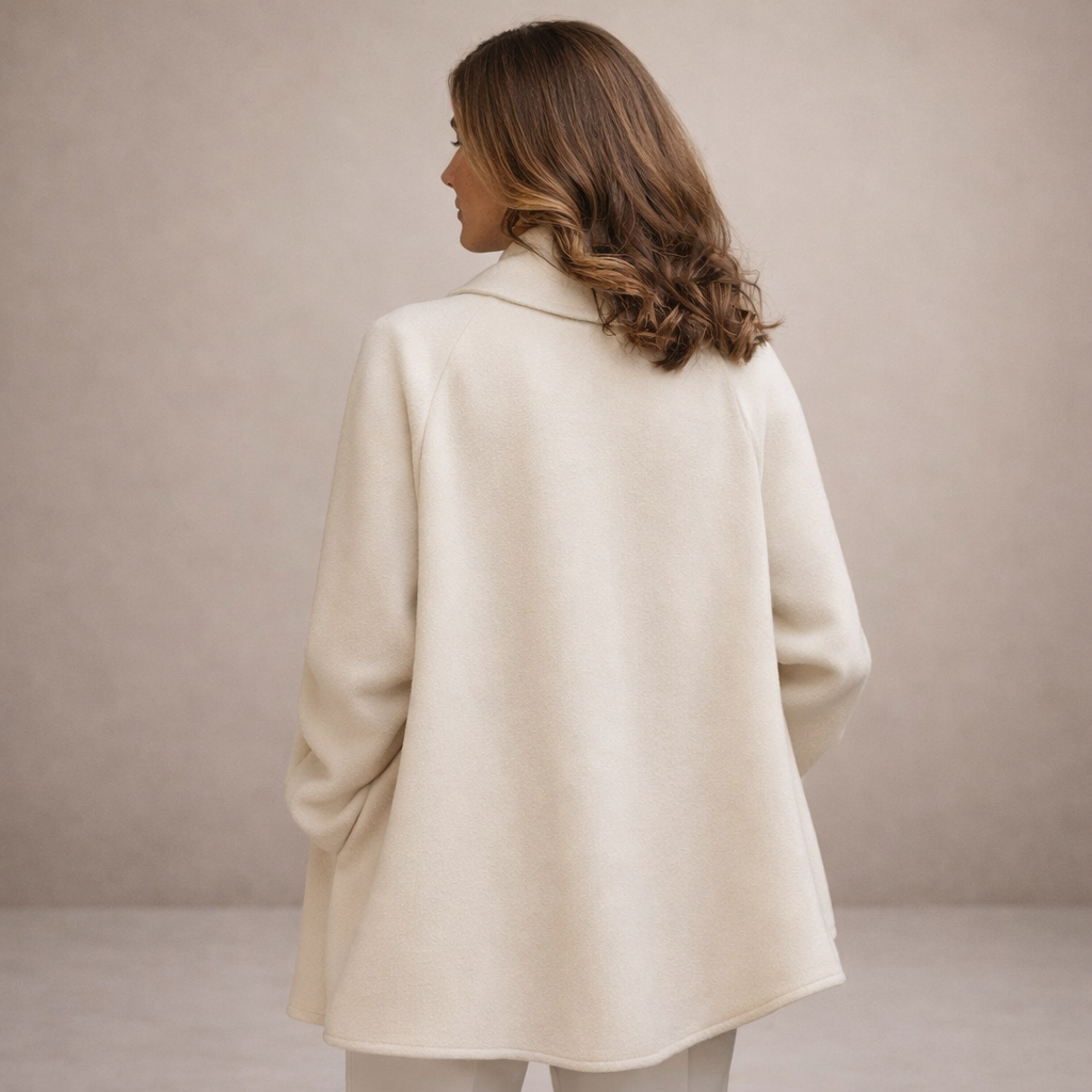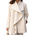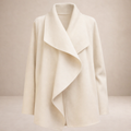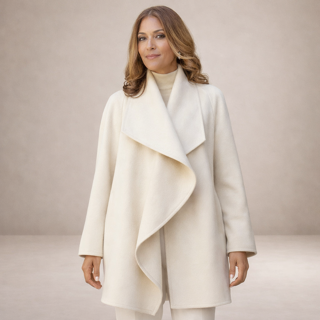 - Details: Brede sjaalkraag, gladde wolblendstructuur en subtiele naden die het ontwerp visueel ondersteunen.