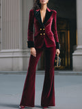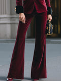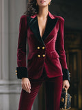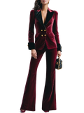 Het Lirenne Pak straalt tijdloze klasse uit met een moderne verfijning. Gemaakt van rijk bordeauxrood fluweel, combineert het double-breasted jasje met opvallende gouden knopen en contrasterende zwarte revers en manchetten, perfect met de hoog getailleerde uitlopende broek die de benen verlengt.