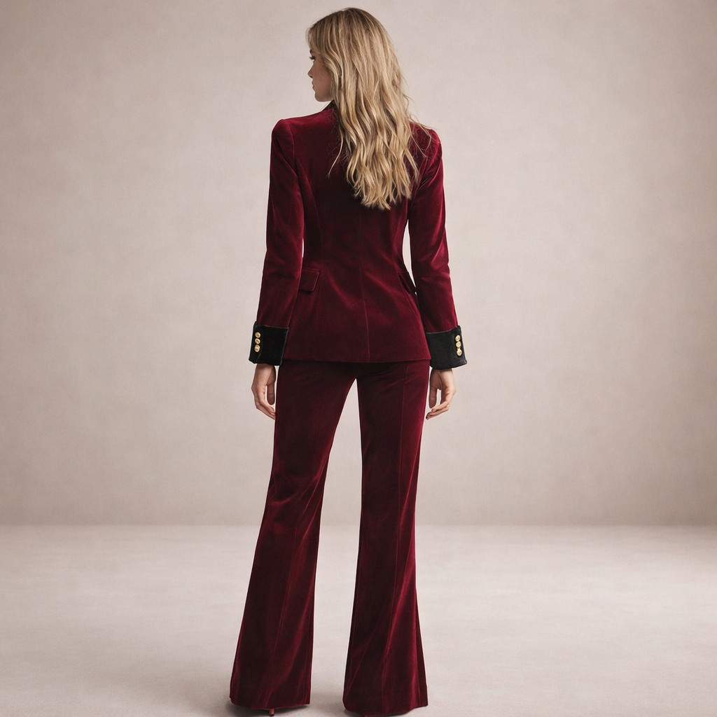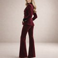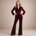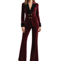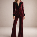 Dit bourgondische fluwelen pak is uitgevoerd met een rijke, zachte textuur en een slank, verzorgd silhouet. Het model bestaat uit een getailleerde blazer met contrasterende revers en een bijpassende broek met wijde pijpen. De blazer is voorzien van een dubbelgeknoopte sluiting, lange mouwen met manchetten en een nette zoom, terwijl de broek recht en soepel valt. Het geheel is afgewerkt met ingetogen visuele details die zorgen voor een samenhangende en representatieve uitstraling binnen een webshopassortiment.