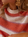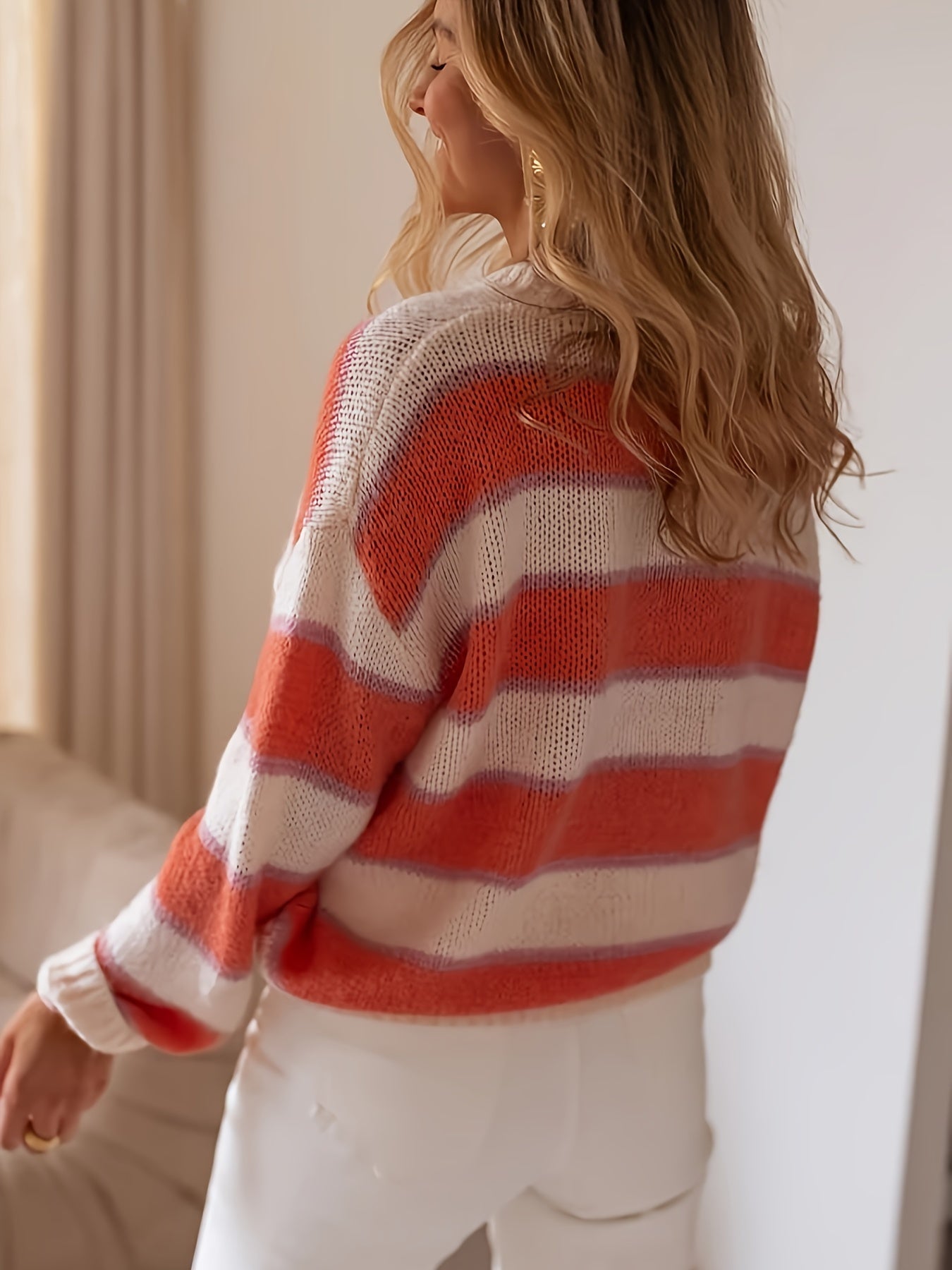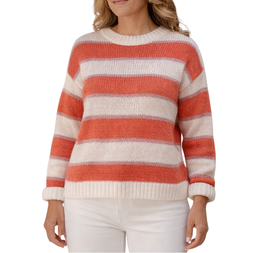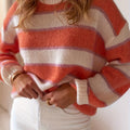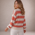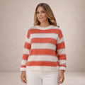 De Liva trui heeft een zachte en frisse uitstraling dankzij de brede strepen in zalmroze, wit en een subtiele lila tint. De grofgebreide structuur geeft de trui een luchtige, cozy look, terwijl de ronde hals en relaxed-fit zorgen voor comfortabel dagelijks draaggemak.