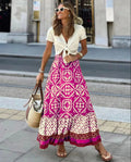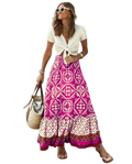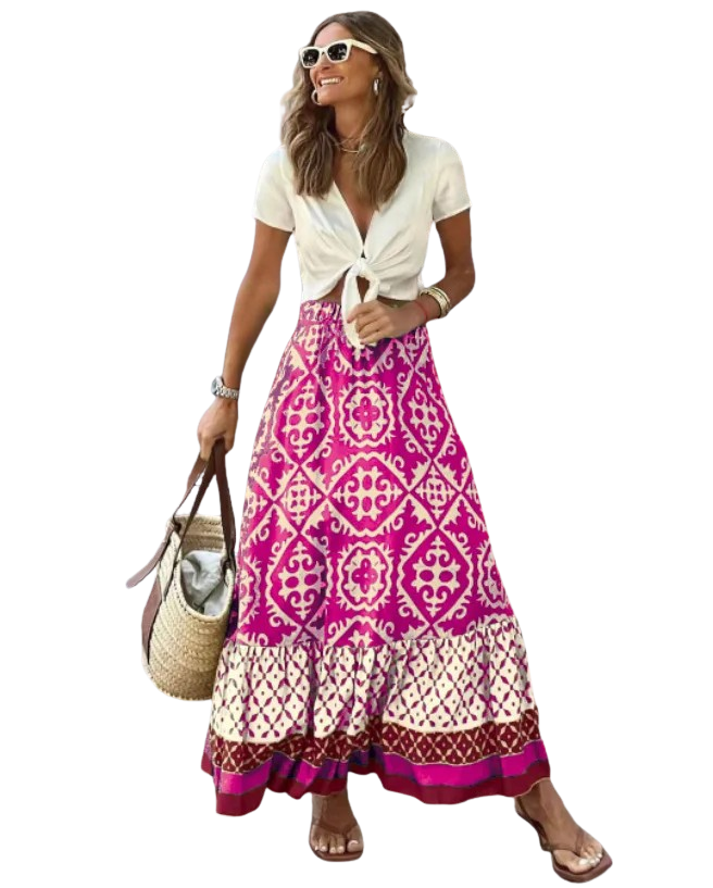 Laat je stijl spreken met deze vibrant bohemian maxi rok in levendig fuchsia en warm crème. Het opvallende etnisch geïnspireerde patroon in combinatie met de elegante ruches aan de onderzijde maakt dit item perfect voor zonnige dagen, vakanties of een zomerse stadswandeling.