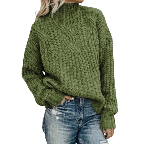 De Mila trui is de perfecte combinatie van warmte, comfort en stijl. Deze prachtige damestrui is ontworpen met een hoge kraag en een grofgebreid patroon dat direct opvalt. De rijke olijfgroene kleur geeft de trui een tijdloze en natuurlijke uitstraling, ideaal voor zowel casual als geklede winterlooks.