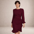 Deze damesjurk heeft een elegante en vrouwelijke uitstraling en is ontworpen voor veelzijdig gebruik. Het model is uitgevoerd met een gesloten halslijn zonder sluiting, wat zorgt voor een strakke en verzorgde look. De lange mouwen hebben een licht volume en zijn afgewerkt met een elastische manchet voor draagcomfort. De jurk is voorzien van een aansluitend bovenlijf en een subtiel getailleerde taille, waarna de rok uitloopt in een volant zoom die beweging en dynamiek toevoegt.