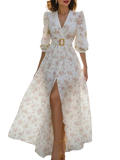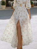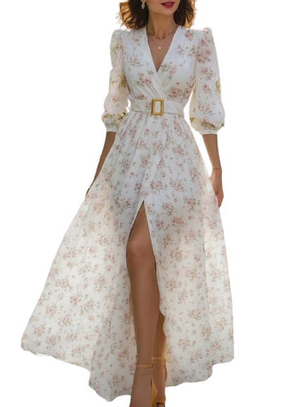 De Ravina-jurk is gemaakt van lichtgewicht chiffon met een subtiel pastelbloemenpatroon op ivoor. De overslag V-hals en zachte pofmouwen creëren een flatterend silhouet. Een stoffen ceintuur met goudaccent benadrukt de taille, terwijl de vloeiende maxi-rok met hoge split zorgt voor elegante beweging.
