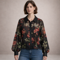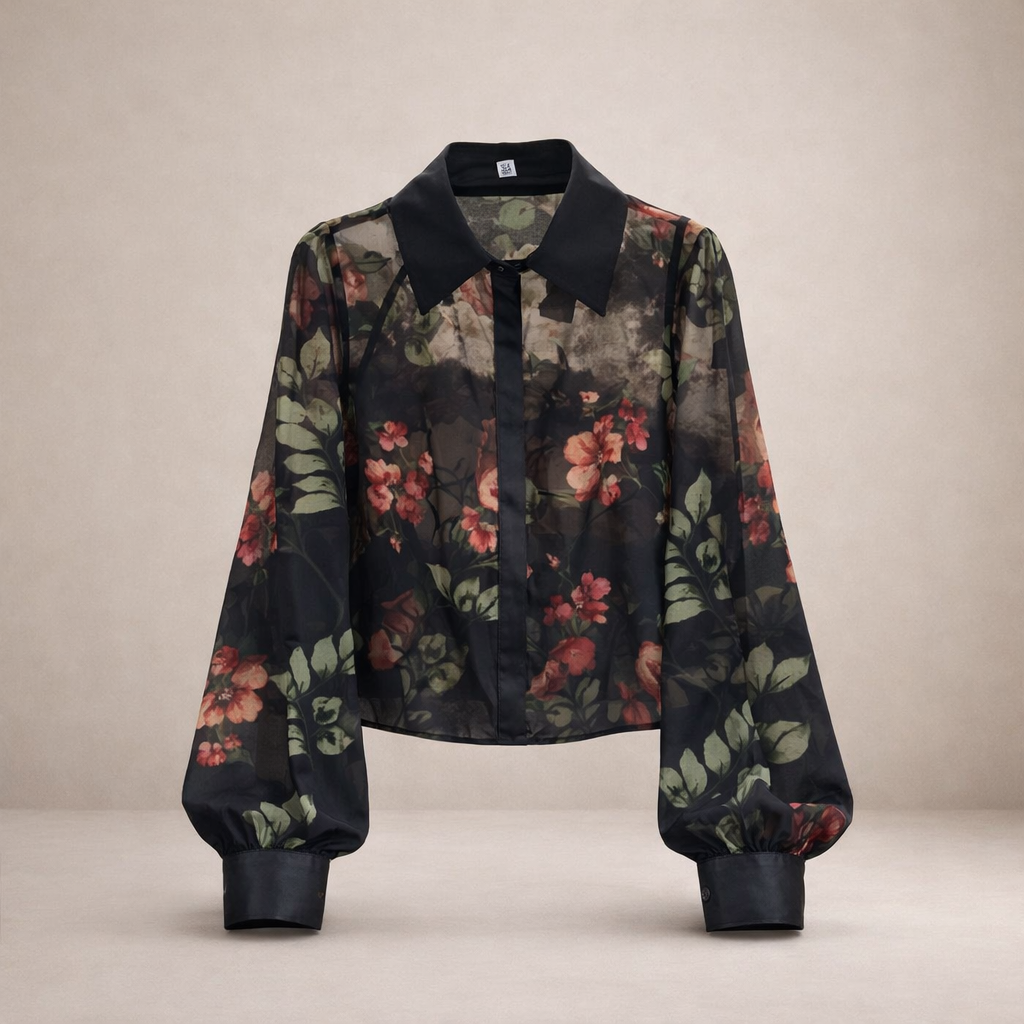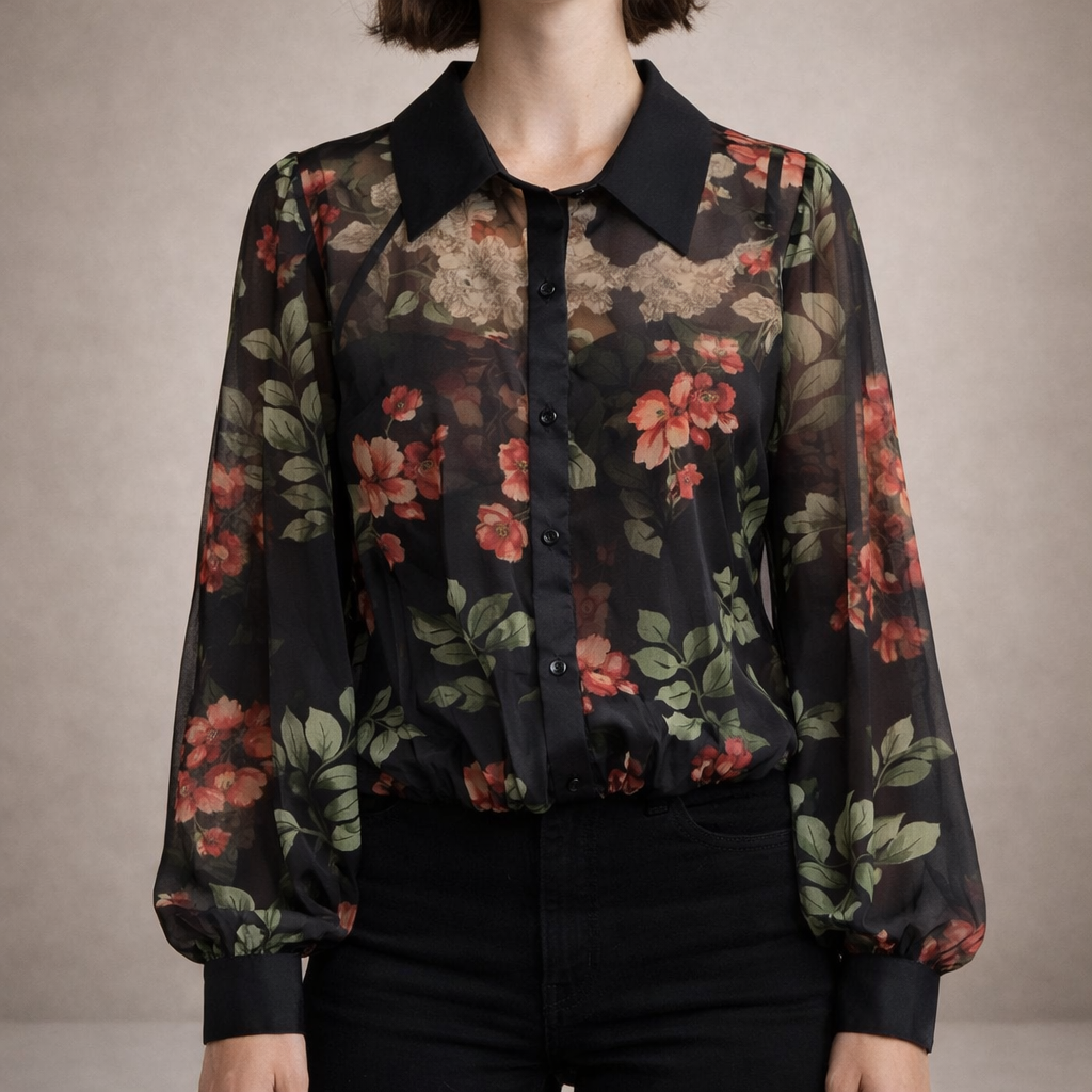 - Details: Bloemenprint, V-hals, licht transparante stof en verfijnde afwerking