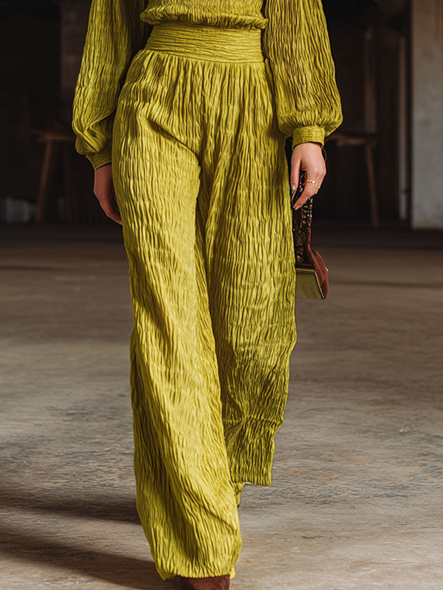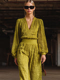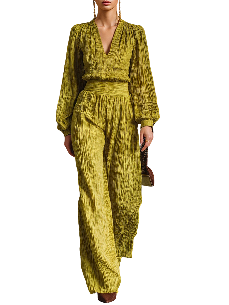 De Aurelie jumpsuit is een combinatie van retro charme en modern comfort, gemaakt van een heerlijk gekreukt en getextureerd materiaal. De zachte avocado-groene kleur geeft een frisse, stijlvolle uitstraling, terwijl de flatterende V-hals, elastische taille en wijde pijpen zorgen voor een comfortabele en elegante pasvorm.