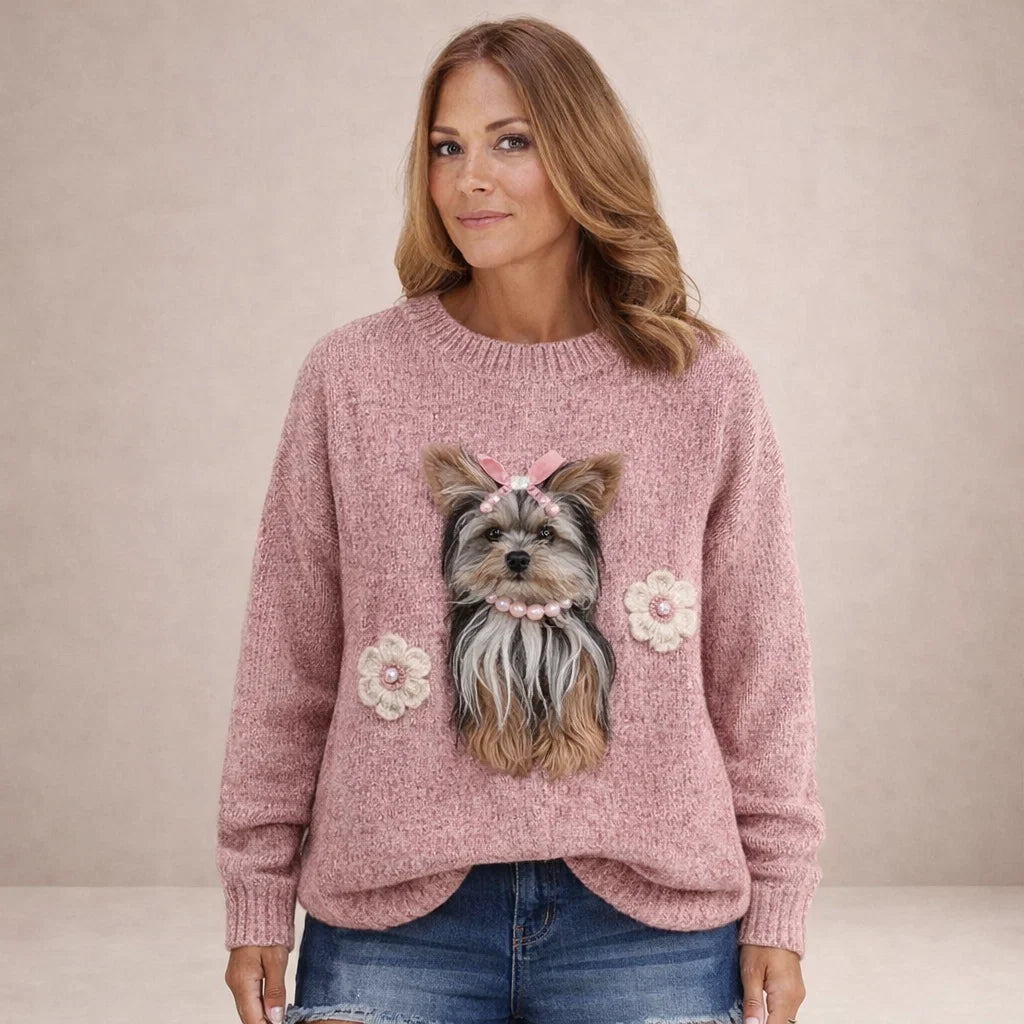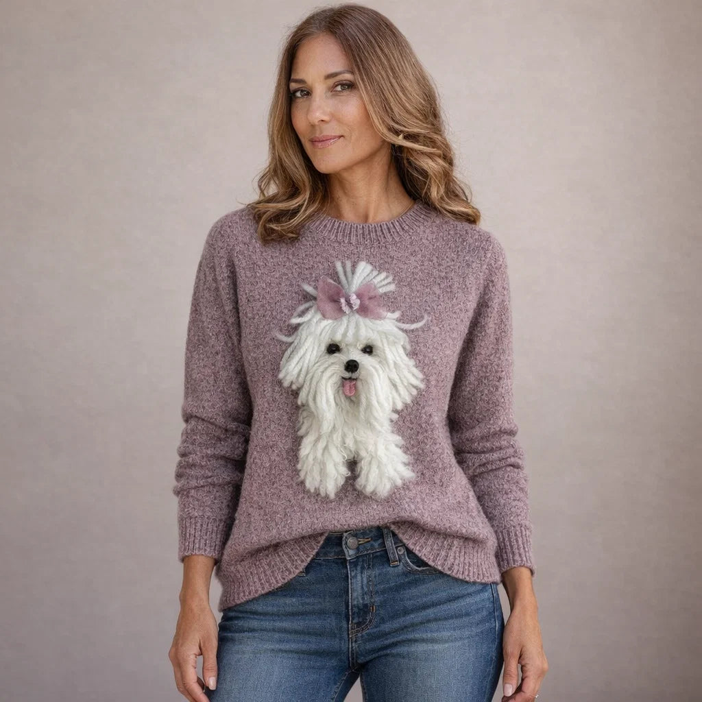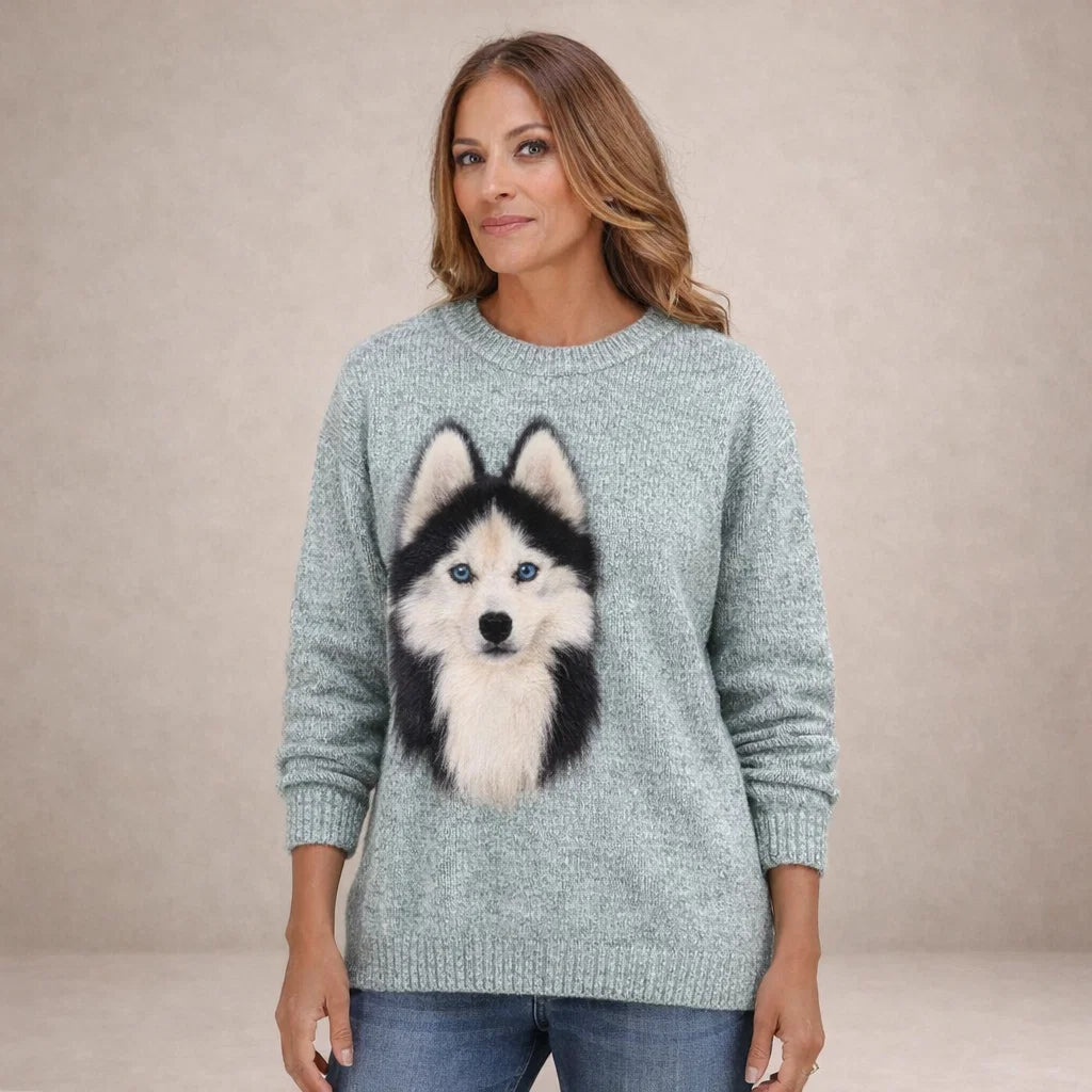 Deze damestrui heeft een speelse en comfortabele uitstraling en is ontworpen voor dagelijks en veelzijdig gebruik. Het model is uitgevoerd met een ronde hals zonder sluiting, wat zorgt voor een klassieke en toegankelijke look. De lange mouwen vallen recht langs de armen en zijn afgewerkt met ribgebreide boorden voor een nette pasvorm. Ook de zoom is voorzien van ribbreisel, wat bijdraagt aan draagcomfort en vormbehoud. De voorzijde is afgewerkt met een opvallende dierenprint, waardoor de trui een herkenbaar en karaktervol accent krijgt. Het ontwerp is algemeen gehouden en geschikt voor meerdere varianten.