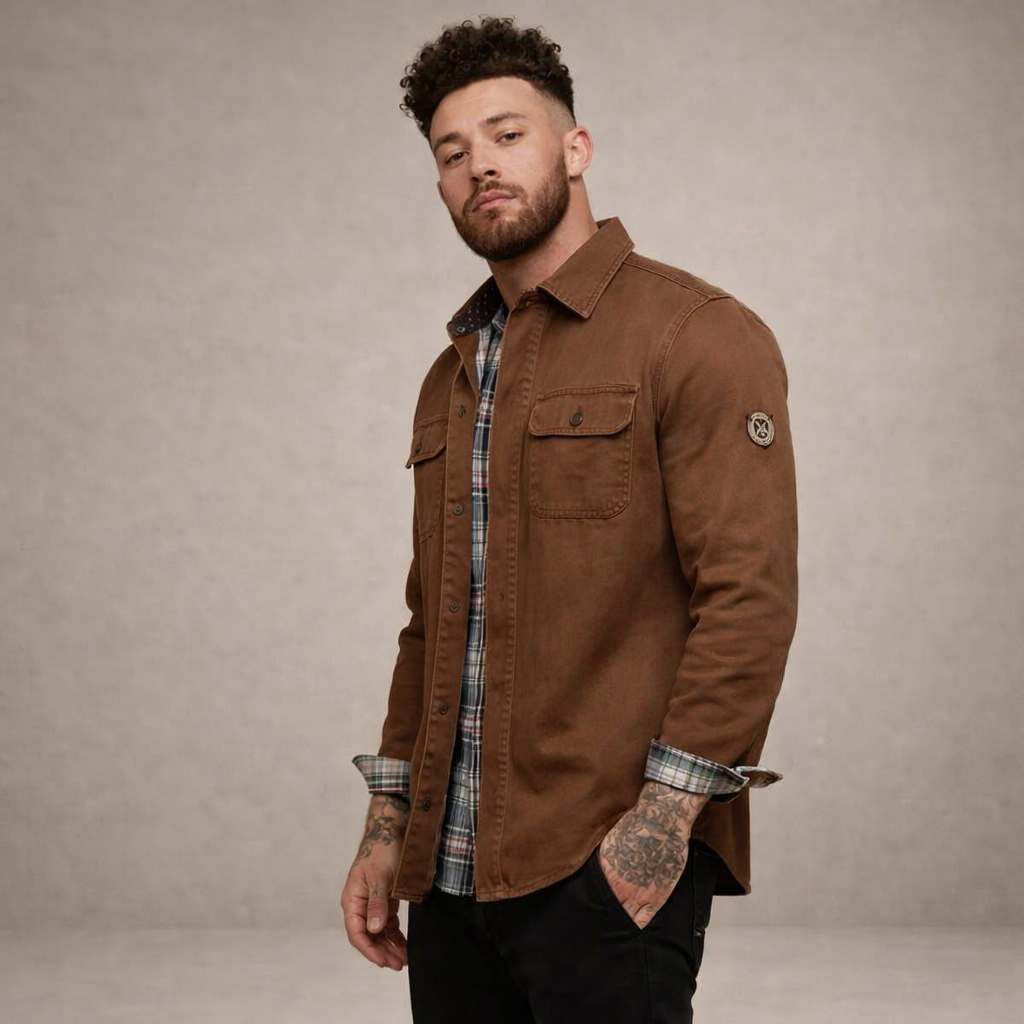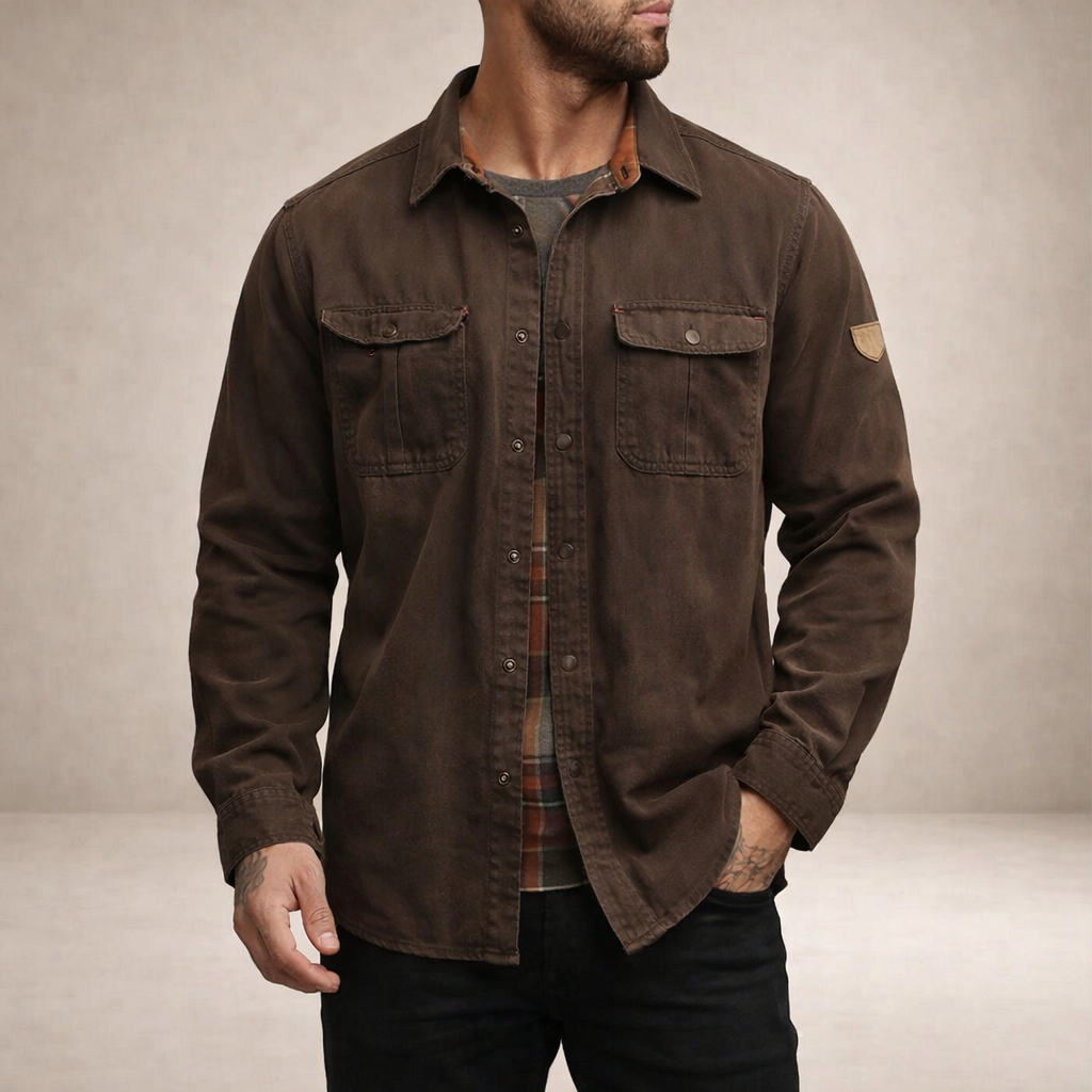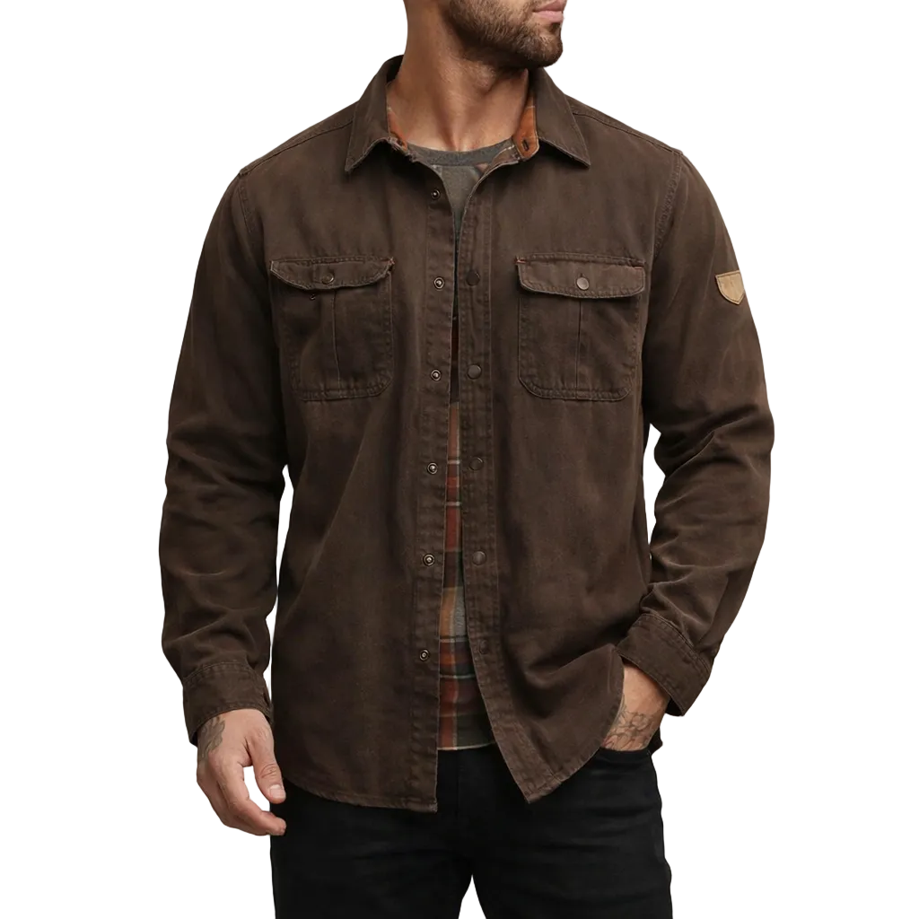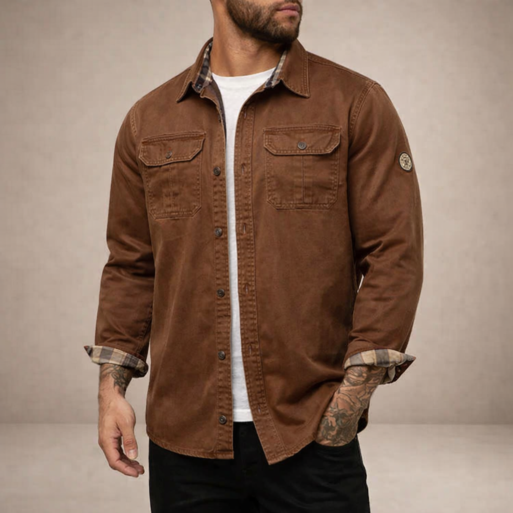 - Details: Vintage geïnspireerd ontwerp met borstzakken, contrasterende binnenvoering en een stoere, duurzame uitstraling.