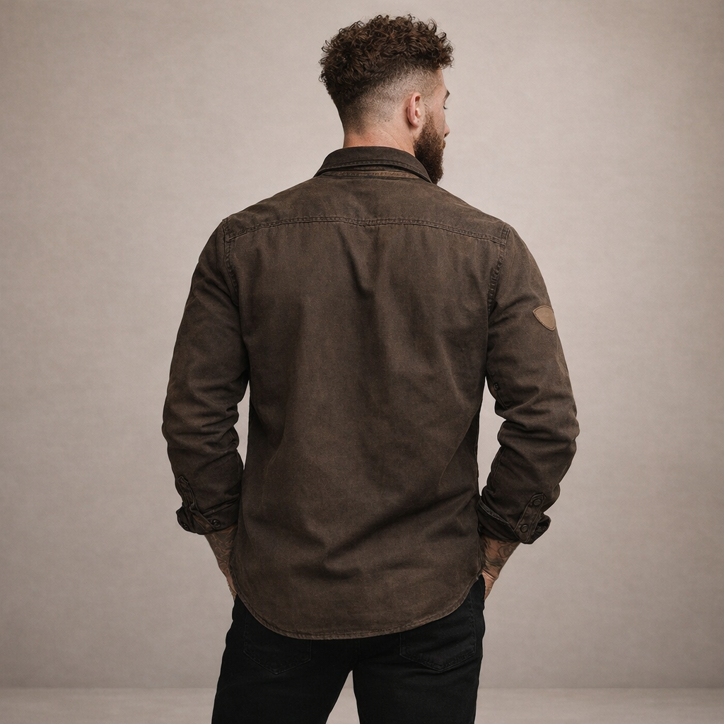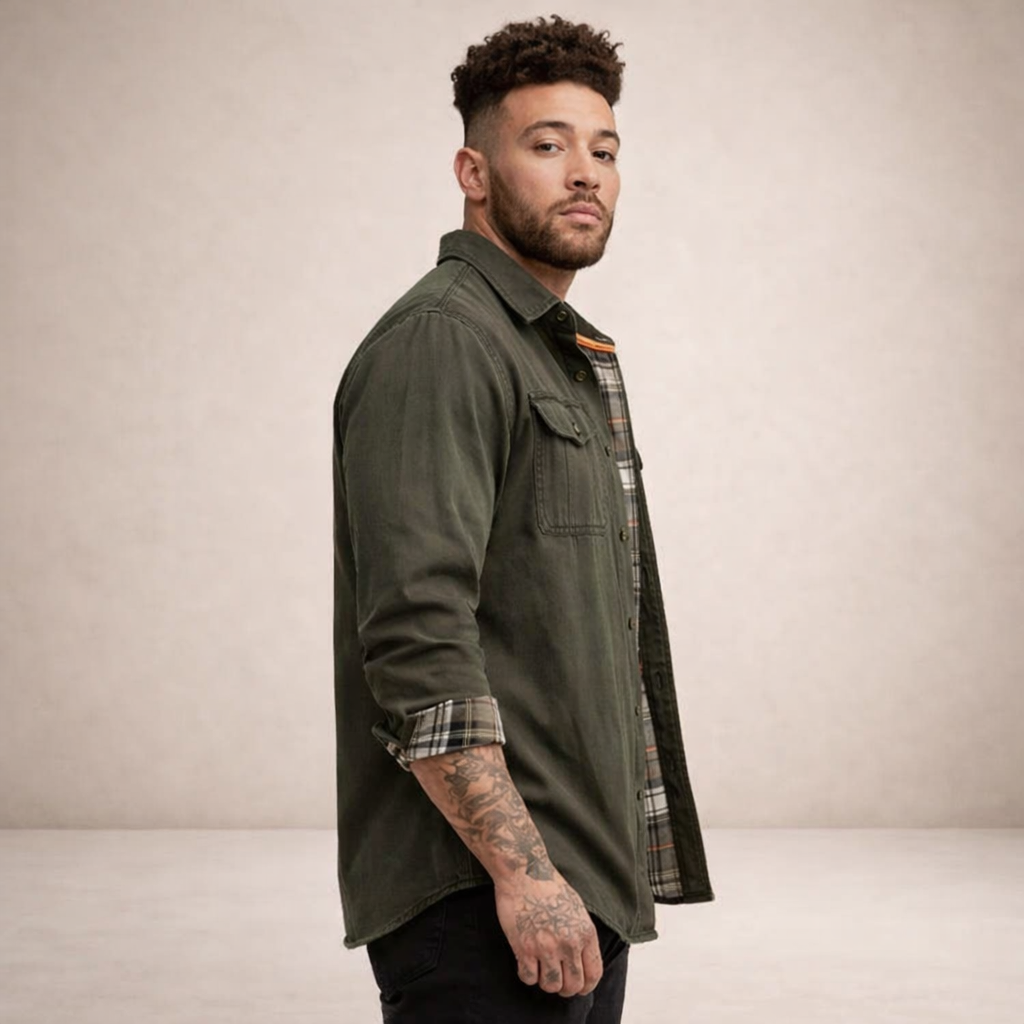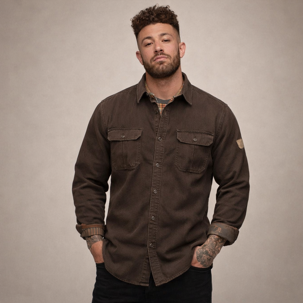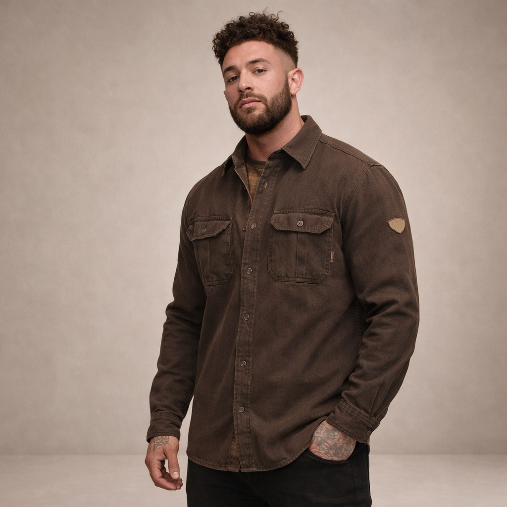 - Details: Vintage geïnspireerd ontwerp met borstzakken, contrasterende binnenvoering en een stoere, duurzame uitstraling.