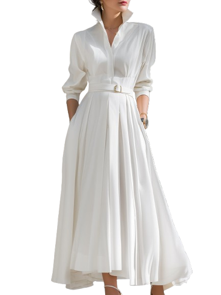 De Valeria-jurk combineert gestructureerde tailoring met een zachte, vloeiende pasvorm, met een scherpe kraag, V-placket en lange gerimpelde mouwen. Een verstelbare ceintuur accentueert de taille, terwijl de geplooide A-lijnrok moeiteloos meebeweegt bij elke stap. Gemaakt van hoogwaardig katoenmix, is de jurk ademend, comfortabel en veelzijdig voor brunches, tuinfeestjes of dagactiviteiten.
