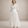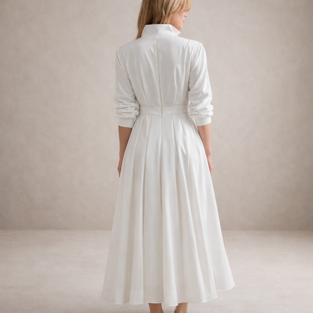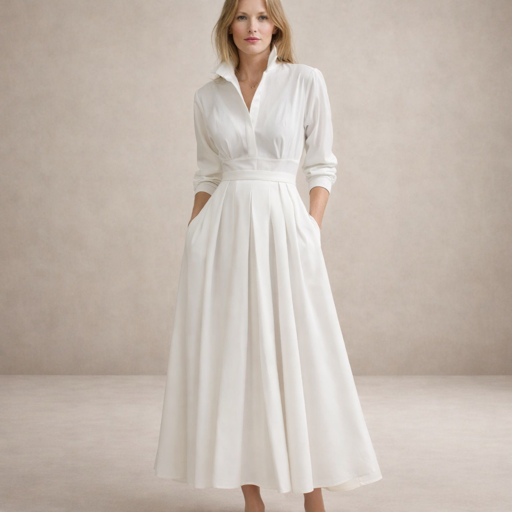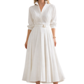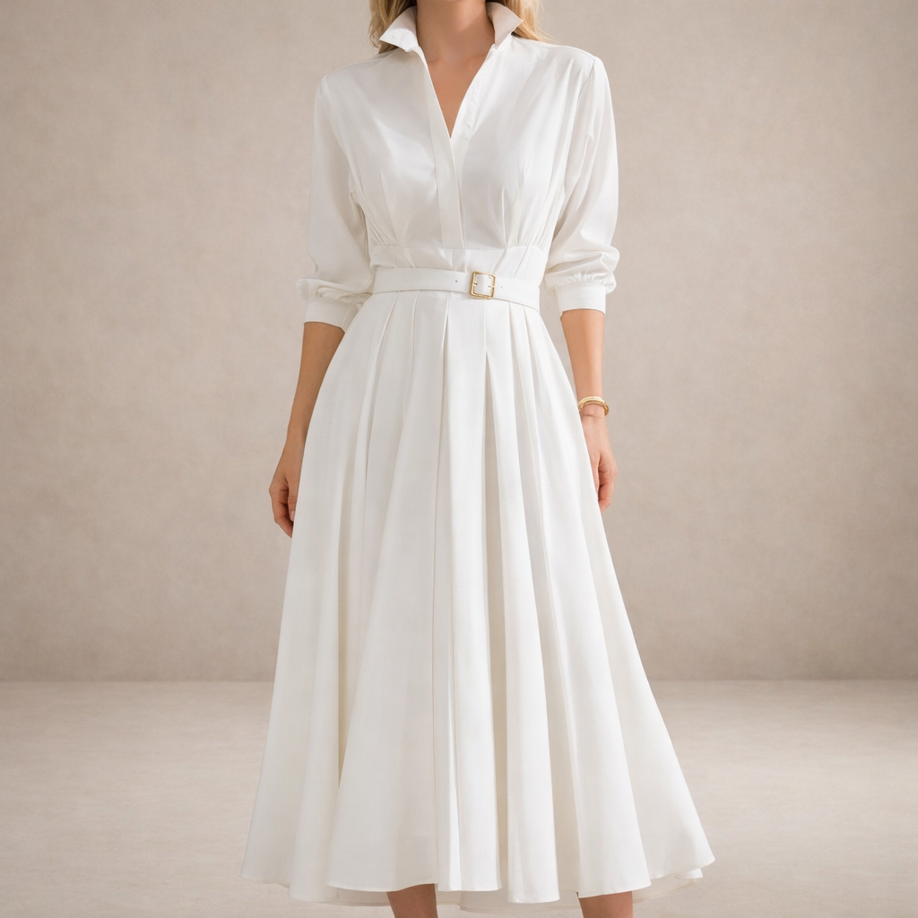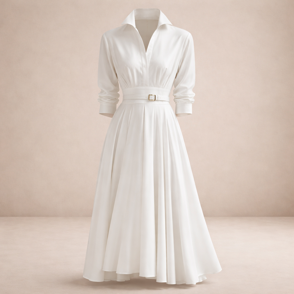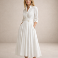 Deze witte overhemdjurk is uitgevoerd met een soepele, licht gestructureerde stof en een vrouwelijk, verzorgd silhouet. Het model heeft een doorlopende knoopsluiting, een opstaande kraag met V-opening en driekwartmouwen met een zachte afwerking. De jurk is voorzien van een vaste ceintuur in de taille, een wijd uitlopende rok en een rechte zoom op midi-lengte, afgewerkt met ingetogen visuele details die passen binnen een nette en veelzijdige uitstraling voor een webshopassortiment.