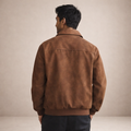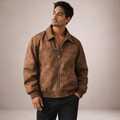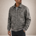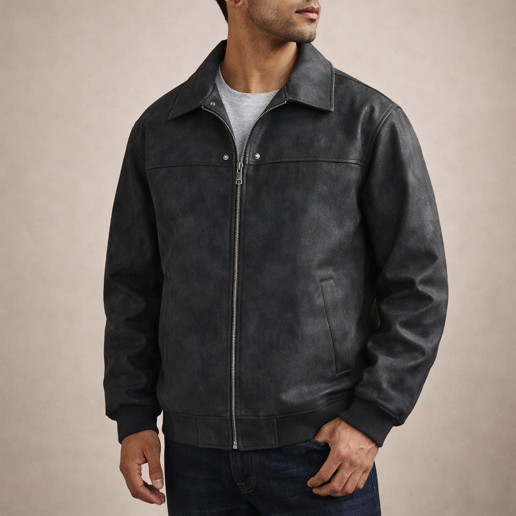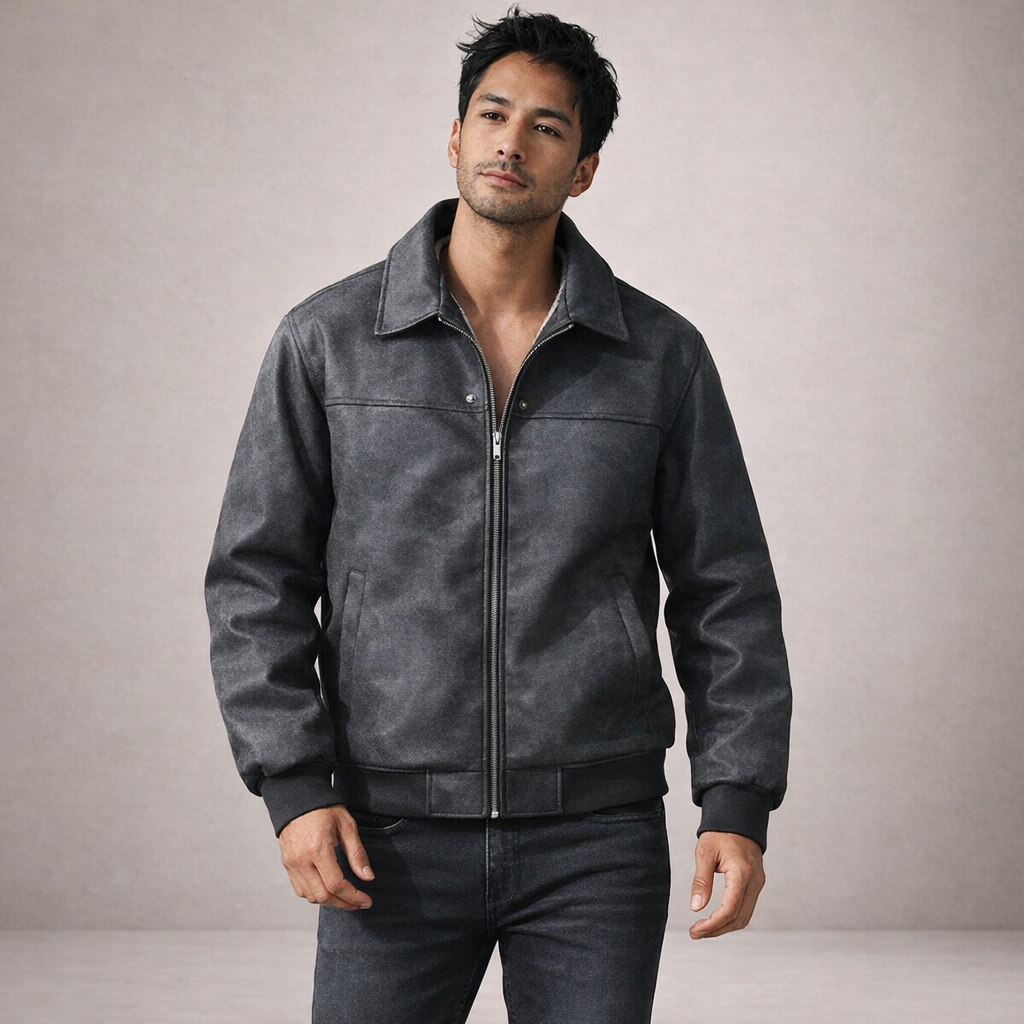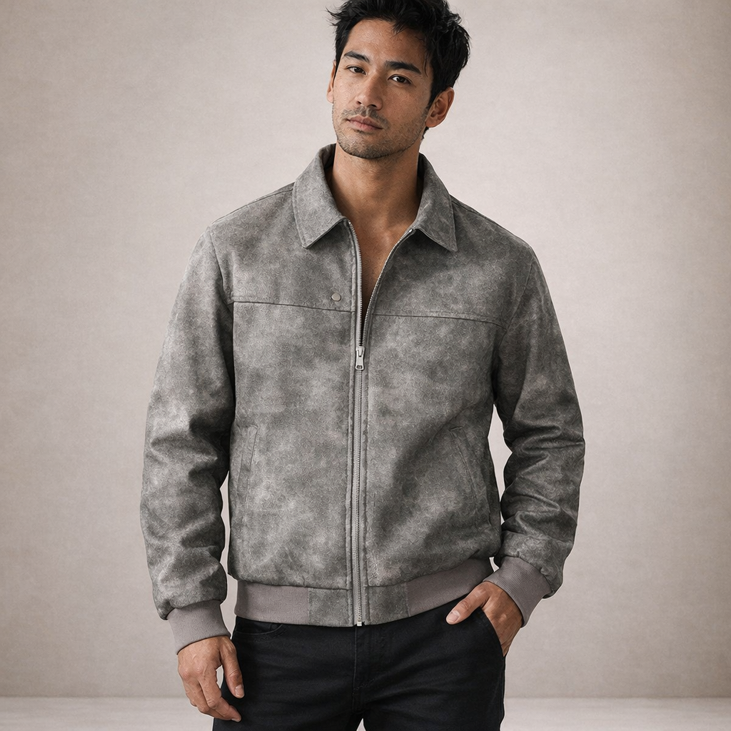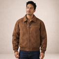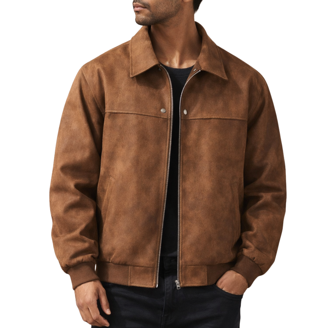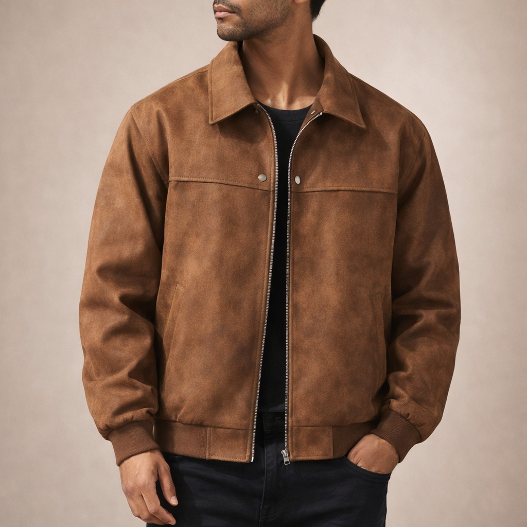 Dit herenjack is uitgevoerd in een suède-look stof met een zachte binnenvoering en heeft een los, comfortabel silhouet. Het model is voorzien van een doorlopende ritssluiting, een klassieke flip kraag en lange mouwen met ribgebreide manchetten. De jas valt recht langs het lichaam, heeft een rechte zoom met ribafwerking en is afgewerkt met ingetogen visuele details die passen binnen een casual en retro-geïnspireerde uitstraling voor een webshopassortiment.