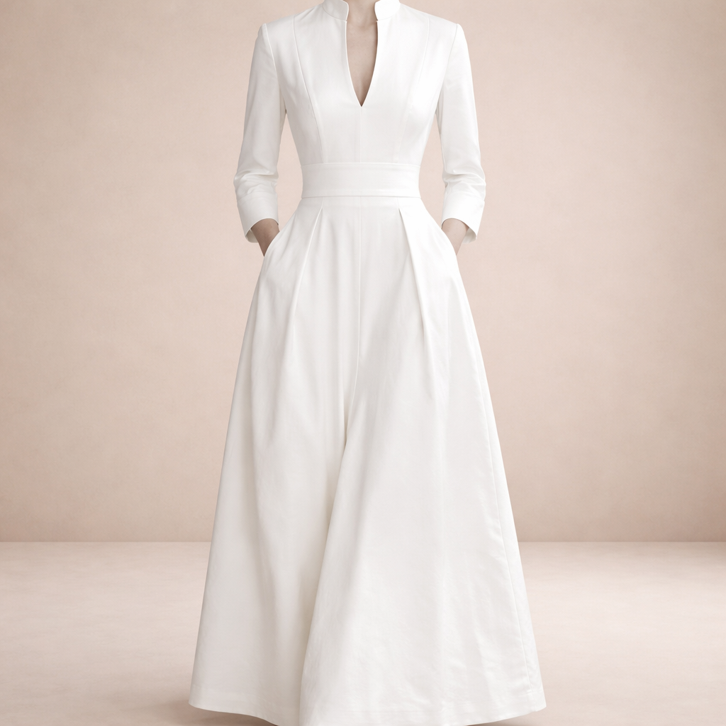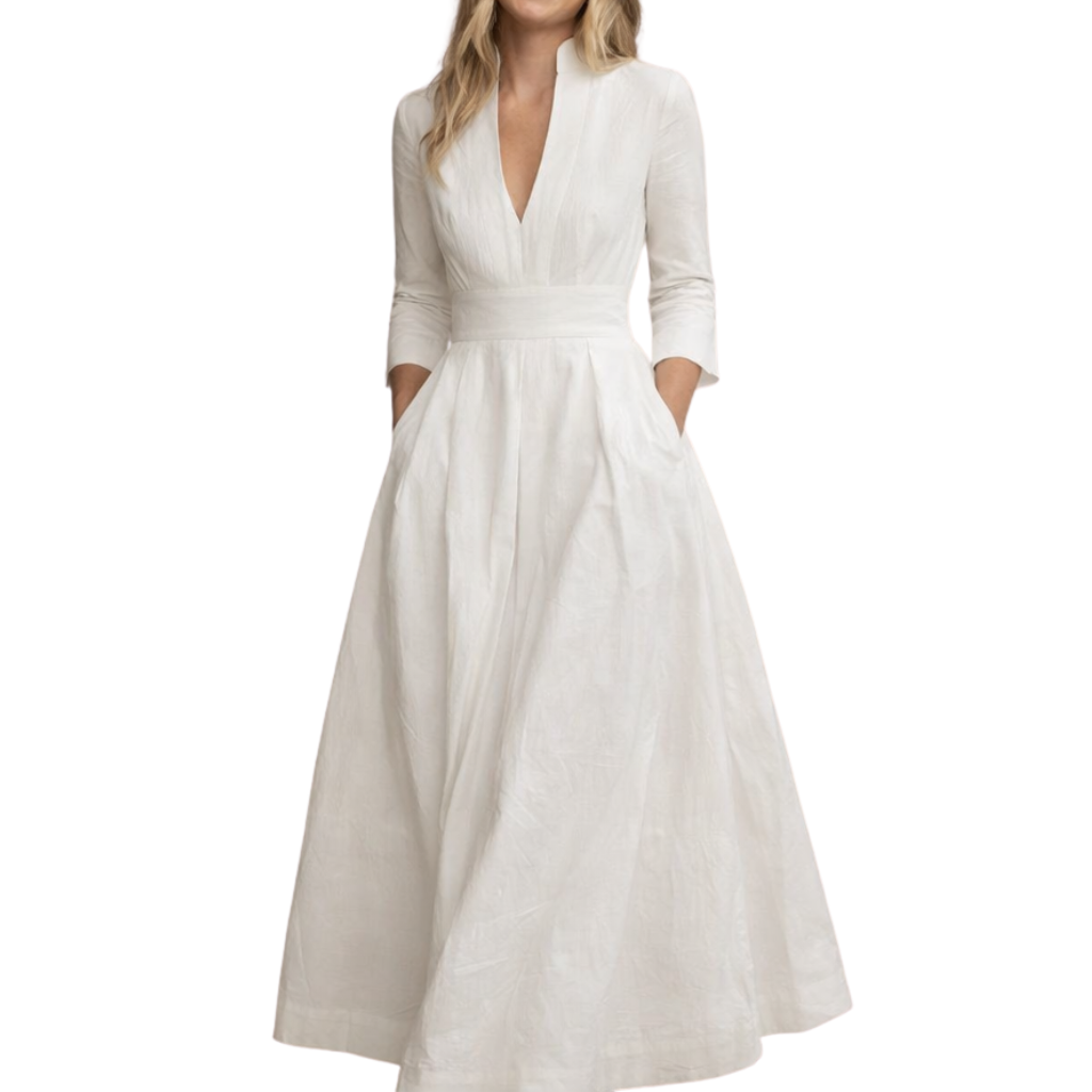 - Details: Diepe V-hals met subtiele kraagafwerking, tailleaccentuerende naad en licht gestructureerde stof.