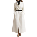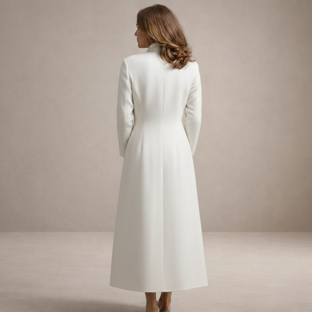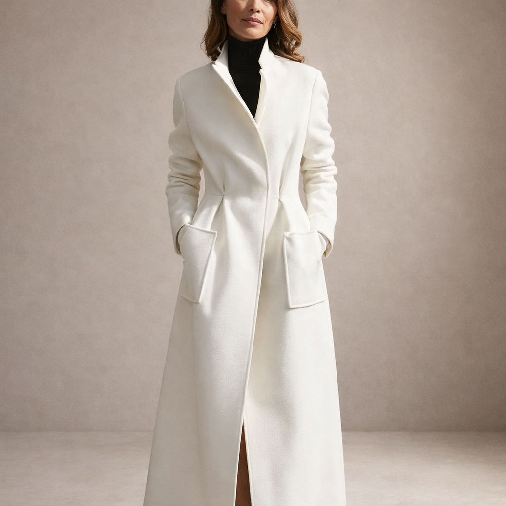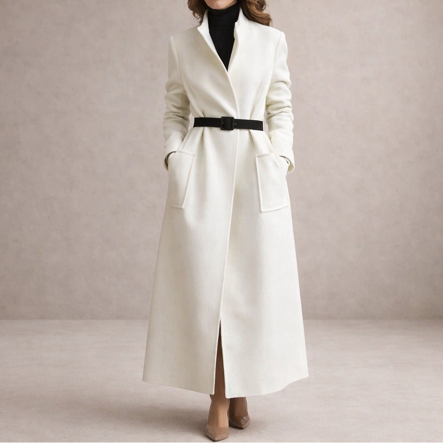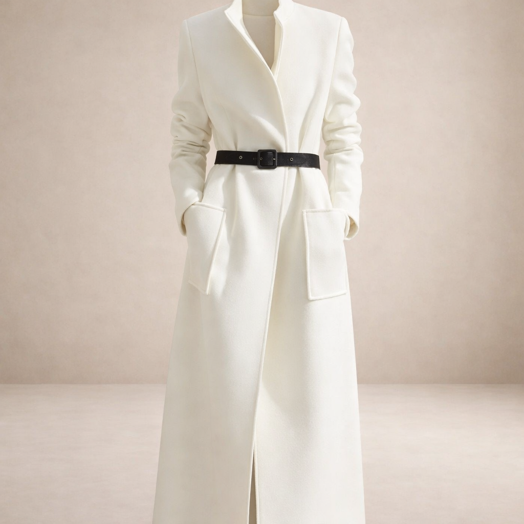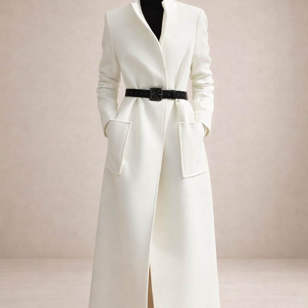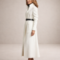 De Wivina-mantel is gemaakt van hoogwaardige wolmix in helder wit. Hij heeft een zwarte ceintuur die de taille vormt en een getailleerde lange snit die de figuur flatteert. Details zoals een gestructureerde kraag, verborgen sluiting en zijzakken combineren stijl met functionaliteit. Ideaal voor stadswandelingen, werk of winteravonden, en biedt kracht en elegantie in één opvallend ontwerp.